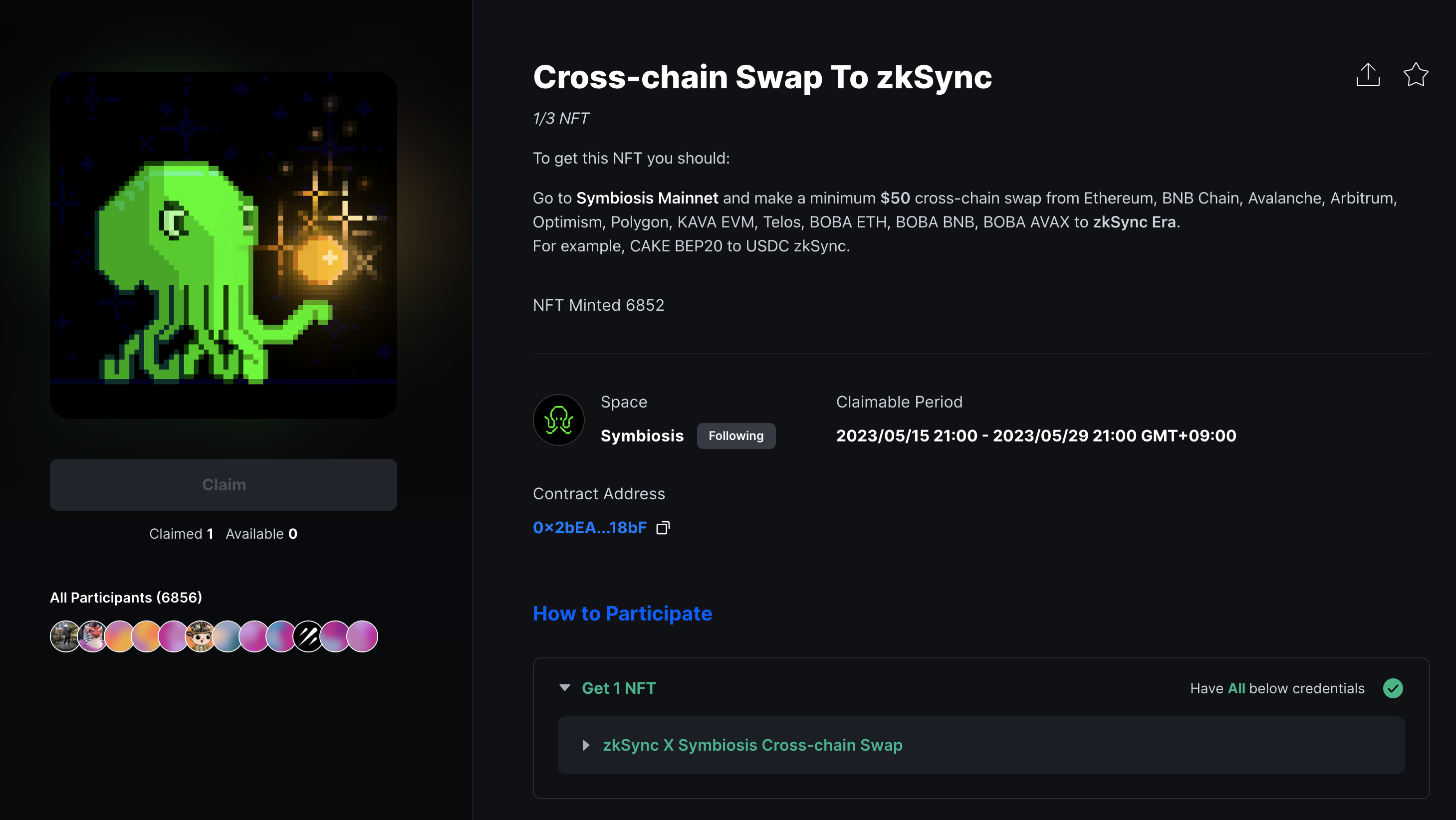 그 외에도 또 다른 크로스체인 스왑 플랫폼인 Symbiosis를 이용해서 이더리움, BNB Chain, 아비트럼, 옵티미즘 등에 보유 중인 자산을 zkSync Era로 이동하고 추가적인 Galxe NFT를 얻을 수 있습니다.