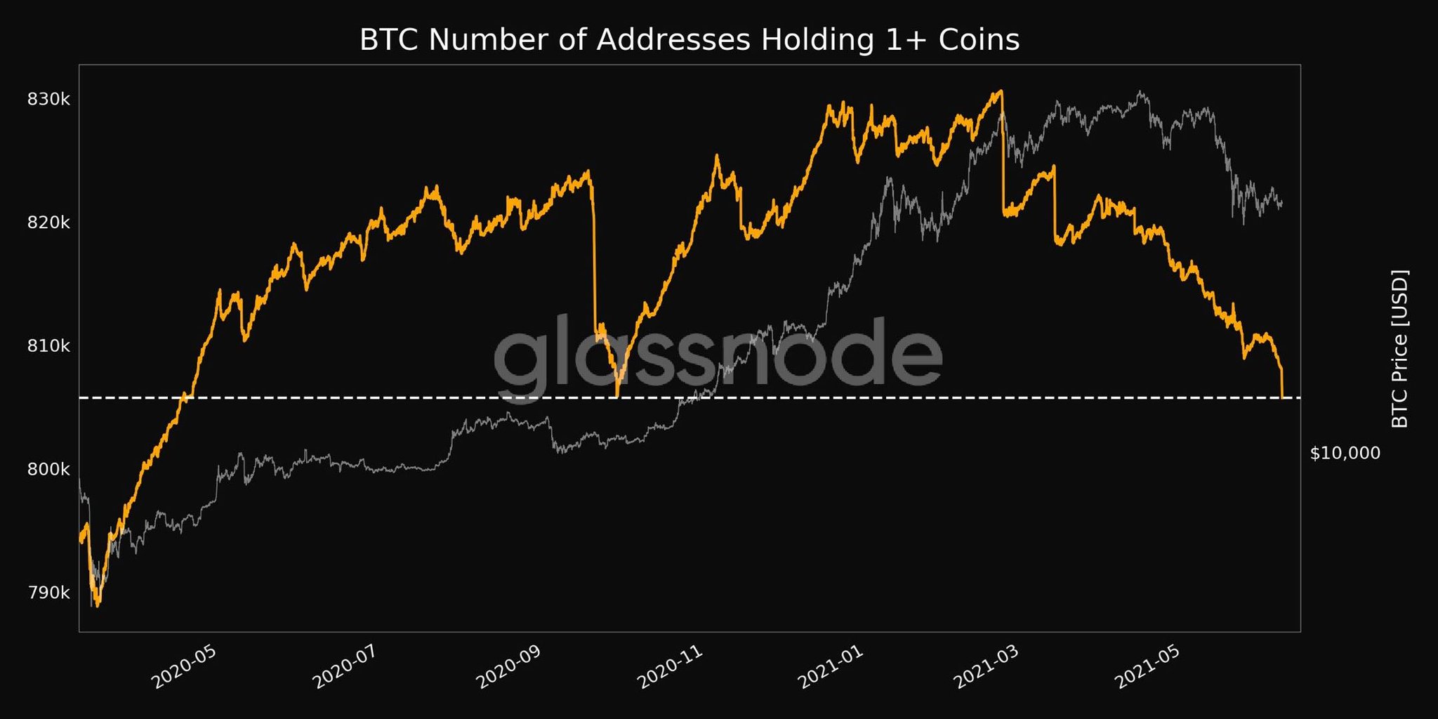예전부터 비트코인을 최소 1개 정도만 잘 가지고 있기도 참 힘들다는 말들이 많았는데, 확실히 지난 3월에 피크를 찍었던 1개 이상의 BTC를 보유한 지갑 주소가 지속적으로 줄어들고 있는 모습입니다. 이는 개인투자자들의 BTC가 기관 투자자들에게 이동 중이라는 점을 시사하기도 합니다.
