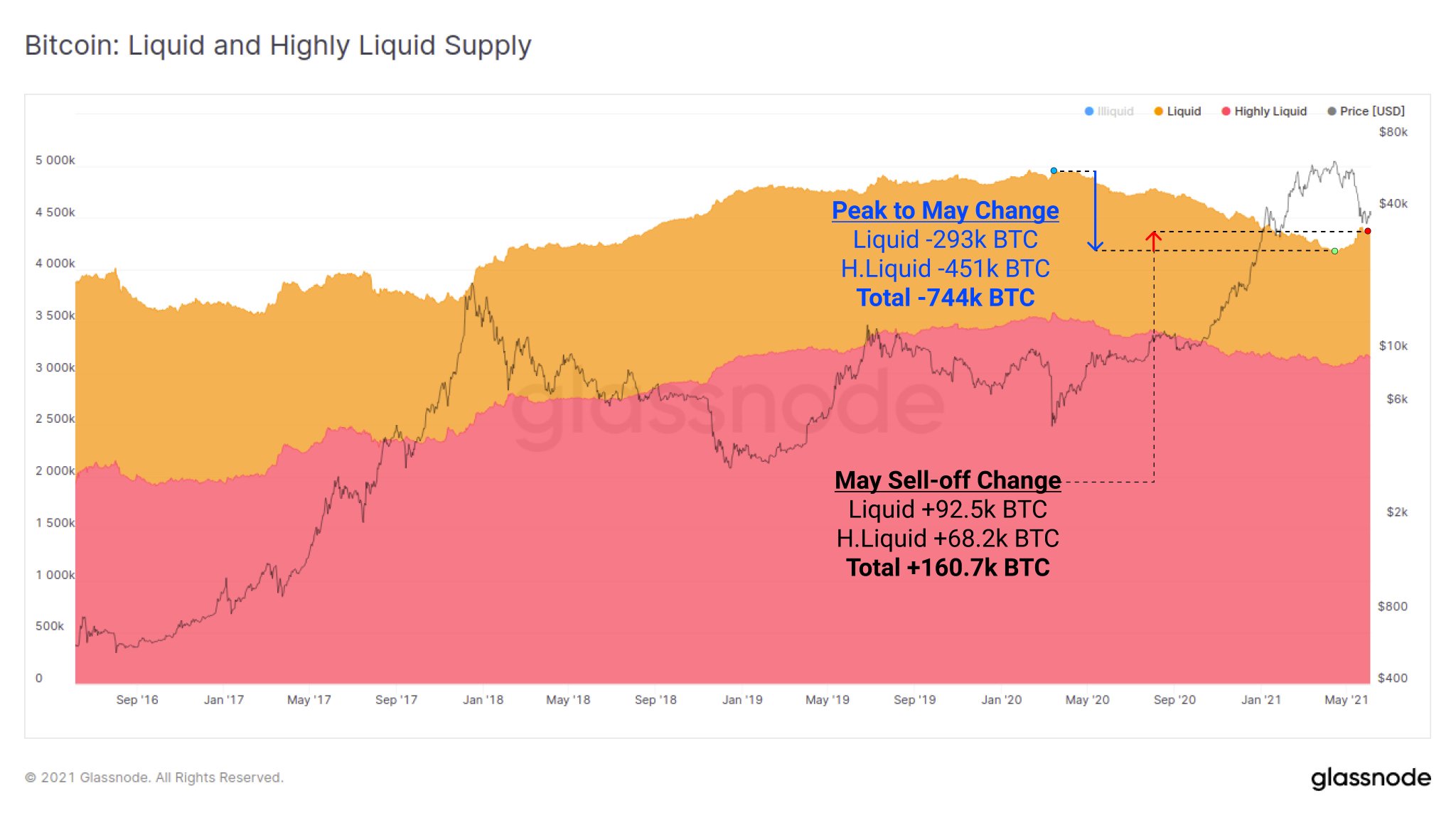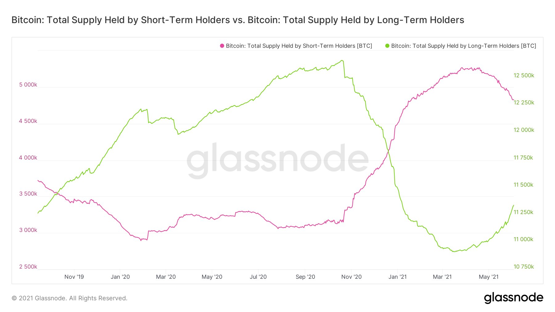 glassnode에서 제공하고 있는 지표들을 살펴보면 지난 석가탄신일 급락 이후에 조금 재미있는 움직임들이 나타나고 있는 것을 확인할 수 있는데, 일단은 인내심이 약한 숏텀홀더(STH)에서 인내심이 강한 롱텀홀더(LTH)쪽으로 비트코인이 움직이고 있는 모습을 확인할 수 있습니다.