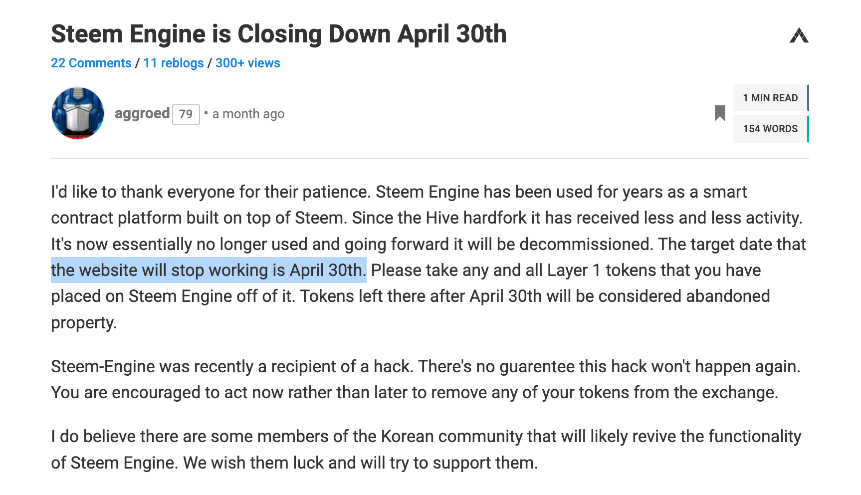 안녕하세요, 디온입니다. 스팀의 사이드체인으로 기능했던 스팀엔진이 2023년 4월 30일에 종료됩니다. 혹시나 모를 피해를 방지하기 위해 스팀엔진 서비스 종료 전 대비 방법에 대한 정보를 공유합니다.