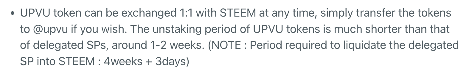 UPVU토큰은 파워다운 기간이 더 짧은 SP(스팀파워)의 유동성 토큰으로 기존에 스팀엔진에서 발행이 되어 있었으며, 언제든 UPVU 토큰을 @upvu 계정으로 전송하면 1:1의 비율로 STEEM으로 교환이 가능한 토큰입니다.