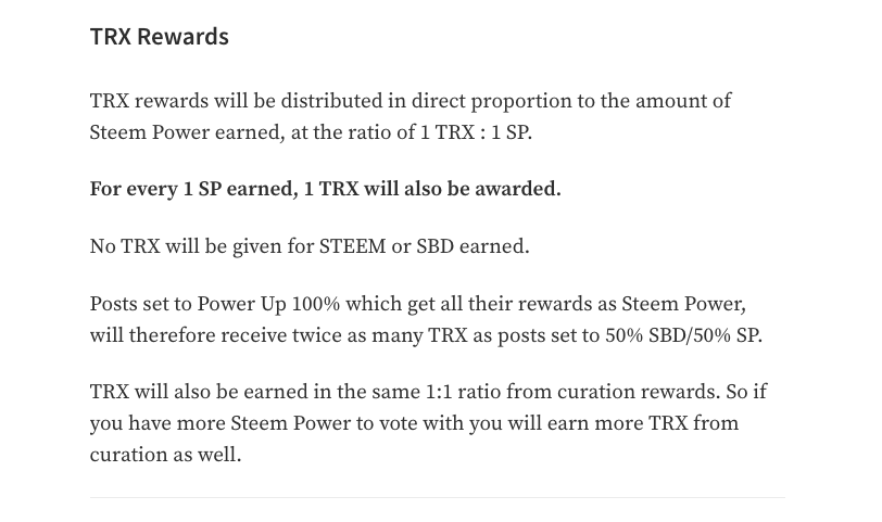 기존에 스팀/스달 50:50 보상을 스팀파워 100%로 조정하여 글을 쓰면 기존과 동일한 수량의 TRX를 얻을 수는 있지만, 어찌되었든 기존 대비 TRX 보상이 50% 하향 조정된 것이다.