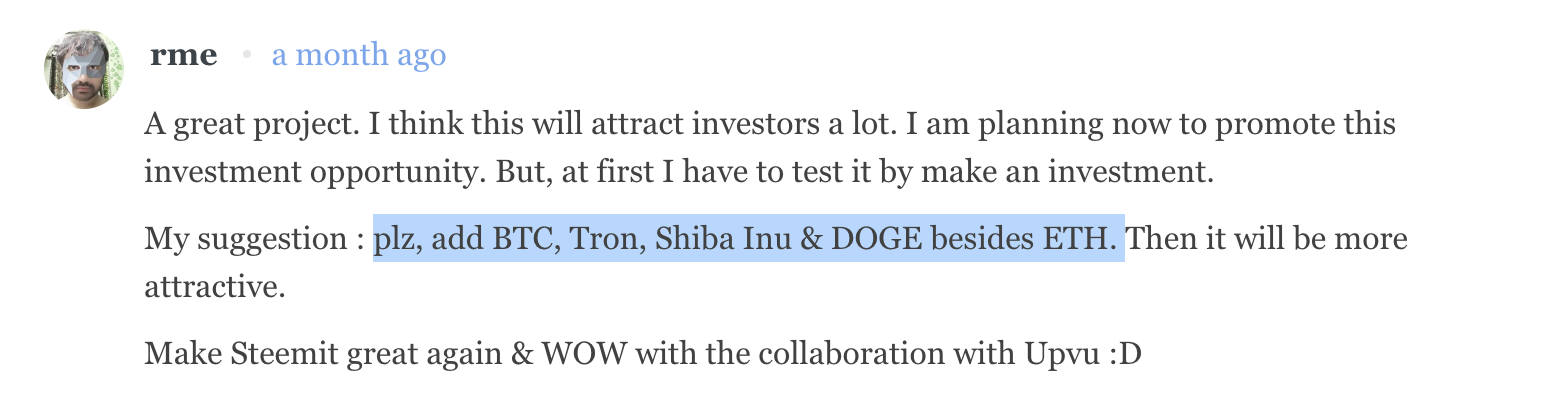 업뷰 언의 출시 후 방글라데시 커뮤니티의 리더인 @rme는 댓글을 통해 BTC, TRX, SHIB, DOGE도 추가해줄 것을 요청했으며, 업뷰 팀에서는 해당 피드백 의견을 적극 수용하여 BTC 출시 전에 BNB스마트체인 기반으로 BNB, SHIB, DOGE를 추가할 예정입니다.