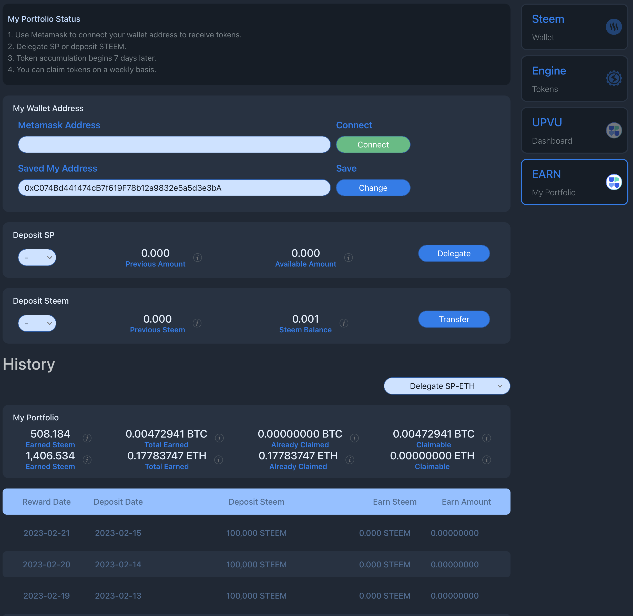 스팀파워 임대 또는 스팀 예치후 추가적으로 뭔가 하실 것은 아무것도 없습니다. UPVU Earn 포트폴리오 현황만 잘 확인하고 정기적으로 클레임만 하면 됩니다. (물론 자동 클레임 기능도 이미 개발되어 있으며 곧 추가될 예정입니다)