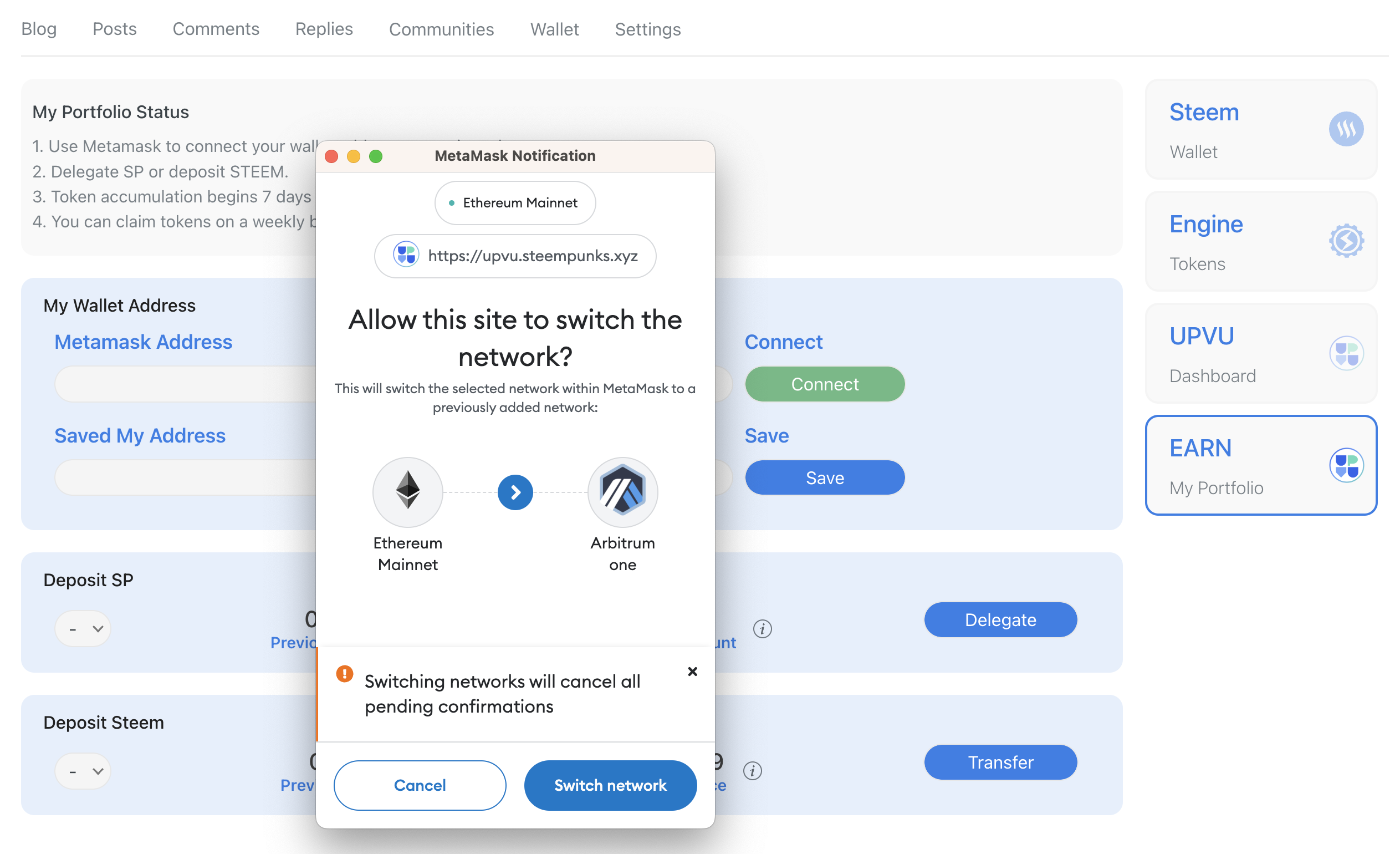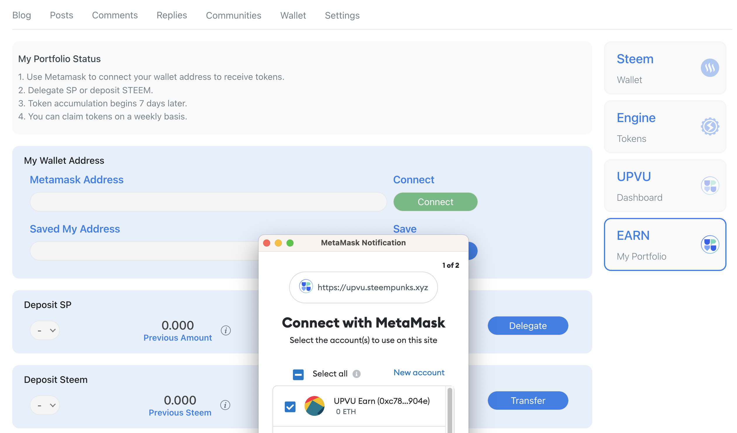 ➡️ ✅ 업뷰 언은 글쓰기 및 보팅과는 관련이 없습니다. 스팀파워를 임대하거나 STEEM을 전송하고 ETH를 모으고자 하는 메타마스크 지갑만 등록하면 끝납니다. (임대자가 글을 쓸 필요가 없습니다)