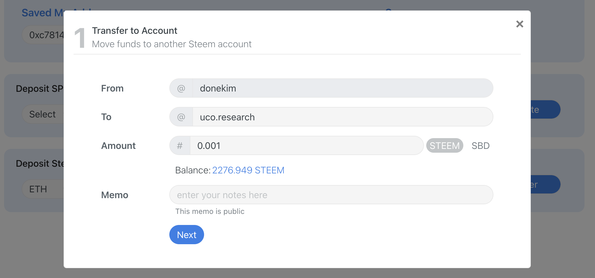 (8) STEEM을 즉시 예치하고자 하는 경우에는 Transfer 버튼을 클릭하고 원하는 수량을 입력하세요 (받을 계정명은 자동 입력되어 있습니다)