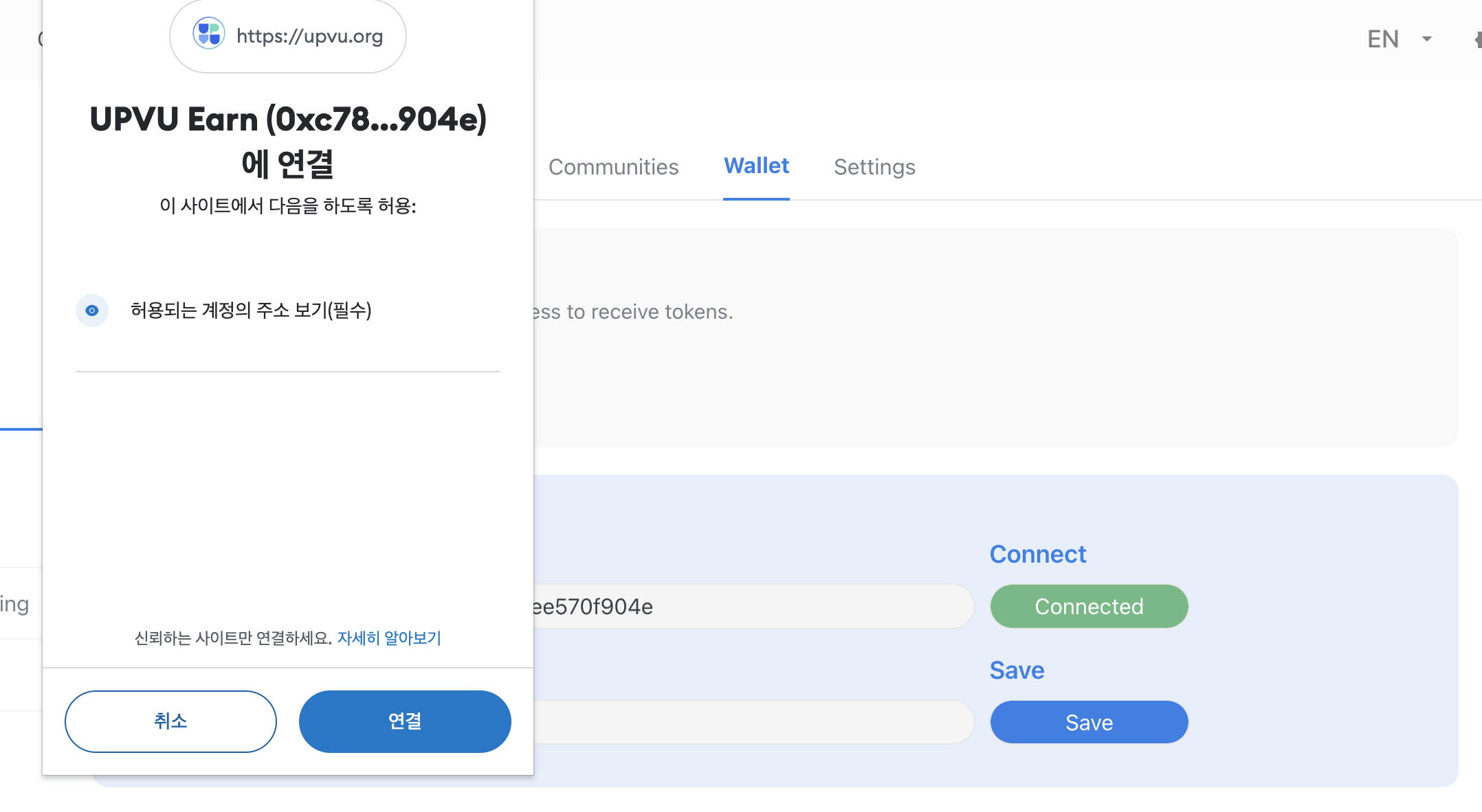 ➋ 메타마스크로 BNB스마트체인 지갑을 연결 후 [Save] 버튼을 클릭하여 지갑을 연결해줍니다.