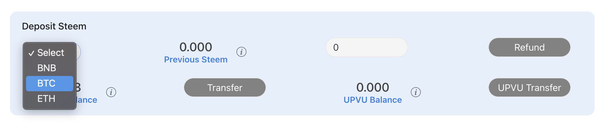 ➍ (STEEM을 예치하여 BTC를 적립하고자 하는 경우) Deposit Steem 하단의 [Select] 탭을 클릭 후 BTC를 선택하고, [Transfer] 버튼을 클릭하여 STEEM을 전송합니다.