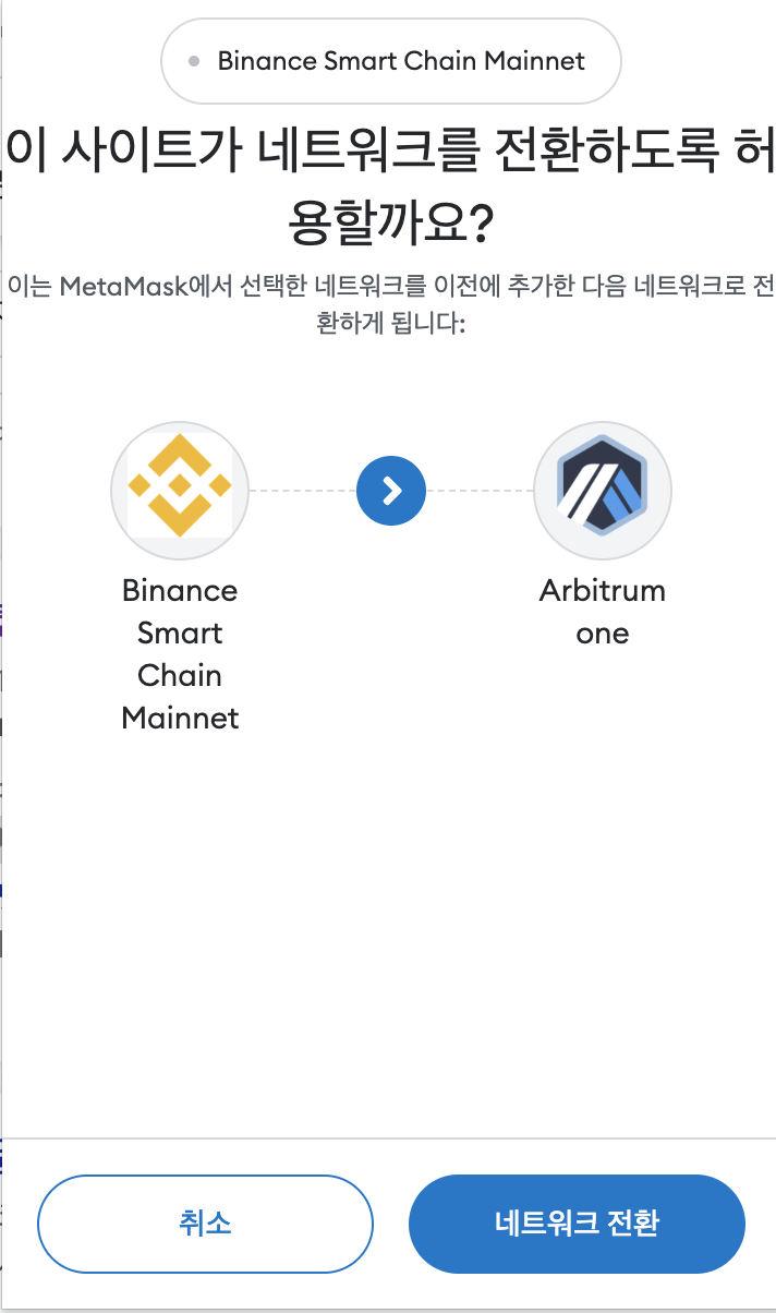 참고로 위와 같이 네트워크를 Arbitrum One으로 전환하도록 허용할까요 라는 팝업이 뜨는 경우 그냥 [취소] 버튼을 클릭하시면 됩니다.