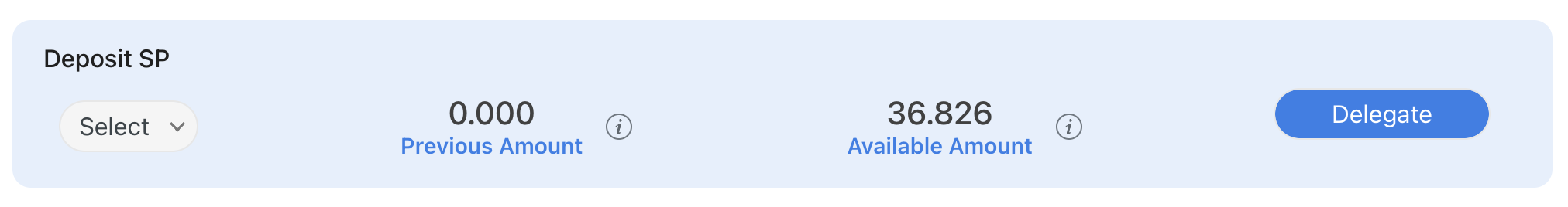 ➌ (스팀파워 임대로 BTC를 적립하고자 하는 경우) Deposit SP 하단의 [Select] 탭을 클릭 후 BTC를 선택하고, [Delegate] 버튼을 클릭하여 임대할 수량을 선택하고 스팀파워를 임대합니다.
