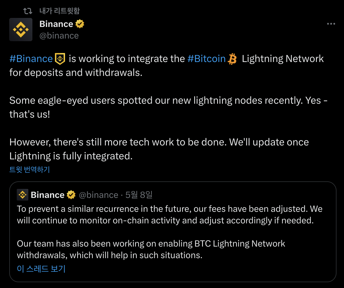 위에서 말씀드렸던 것처럼 비트코인은 이더리움이나 BNB스마트체인 보다는 라이트닝 네트워크를 활용하는 것이 가장 적합하며, 머지 않은 시기에 바이낸스에서도 라이트닝 네트워크 입출금을 지원할 것으로 예상됩니다.