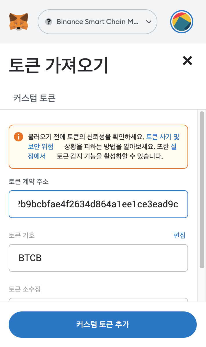 ➏ 토큰 계약 주소란에 아래의 BNB스마트체인 BTC 컨트랙트 주소를 붙여넣기 합니다