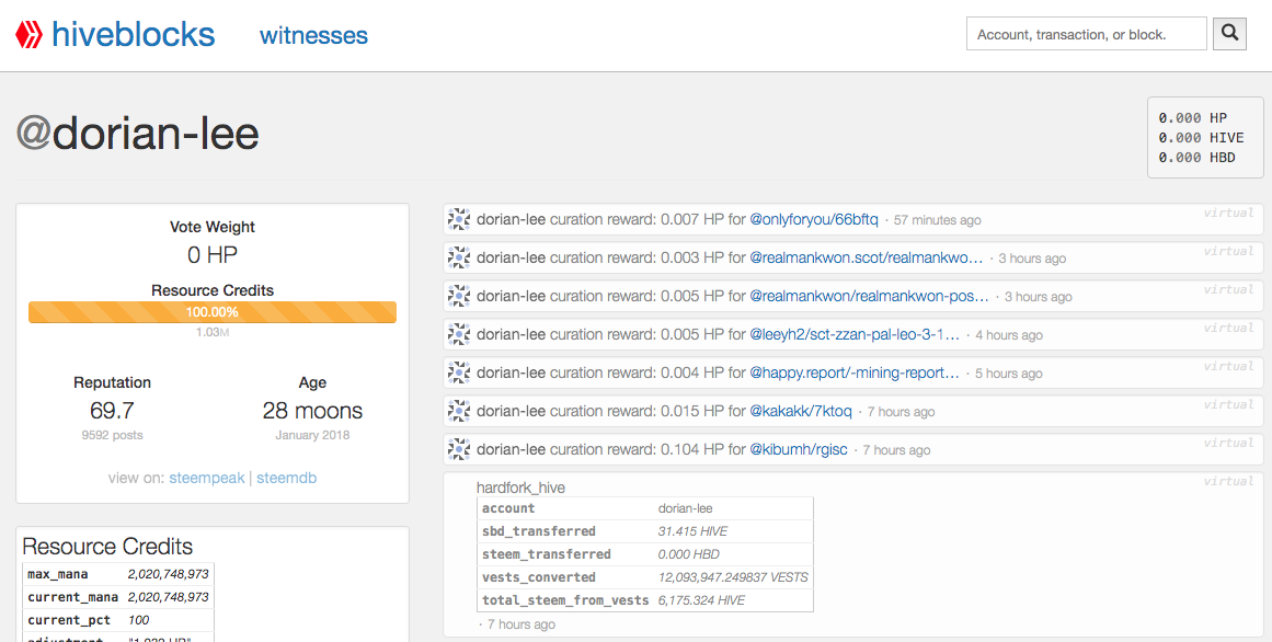 어제 밤 11시부로 HIVE가 스팀잇으로부터 공식적으로 분리되었습니다. 블로그 사이트는 잘 작동하고 있으나 지갑 사이트는 오류로 아직 들어갈 수 없네요. 대신 hiveblocks.com 사이트를 통해 계정을 조회할 수 있습니다. 이미 알고 있지만, 제 계정도 에어드롭을 받을 수 없는 계정으로 분류되어 HP, HIVE는 하나도 없습니다. 다수의 한국인 계정들이 이와 같은 상황이라 하이브를 사용할지는 미지수입니다. 그냥 원래 쓰던 스팀잇에 집중해야죠. 실험 삼아 하이브를 가끔 쓸 일은 있을 거 같습니다.