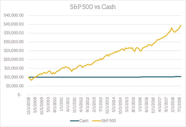 은행의 현금은 장기적으로 인플레이션과 기타 자산에 손실을 입습니다. 아래 그래프를 50년 이상으로 확장하면 결과는 훨씬 더 극단적일 것입니다.