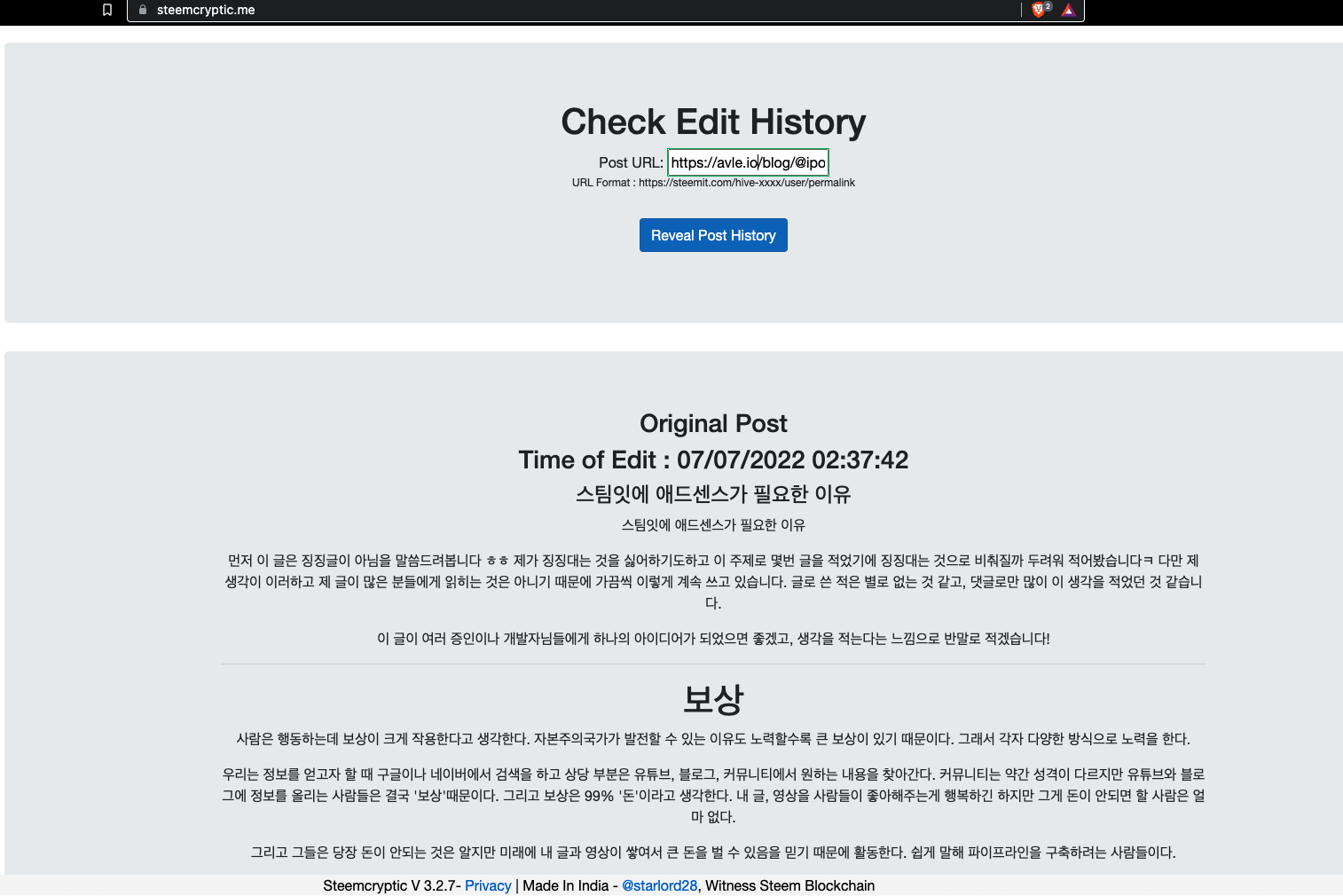 저도 몰랐는데, @starlord28가 개발한 스팀크리틱(steemcryptic.me)에서 수정 이력을 확인할 수 있습니다! 스팀에 이런 기능이 가능한지 처음 알았습니다.
