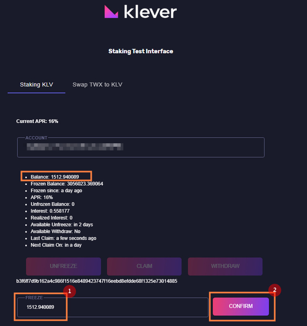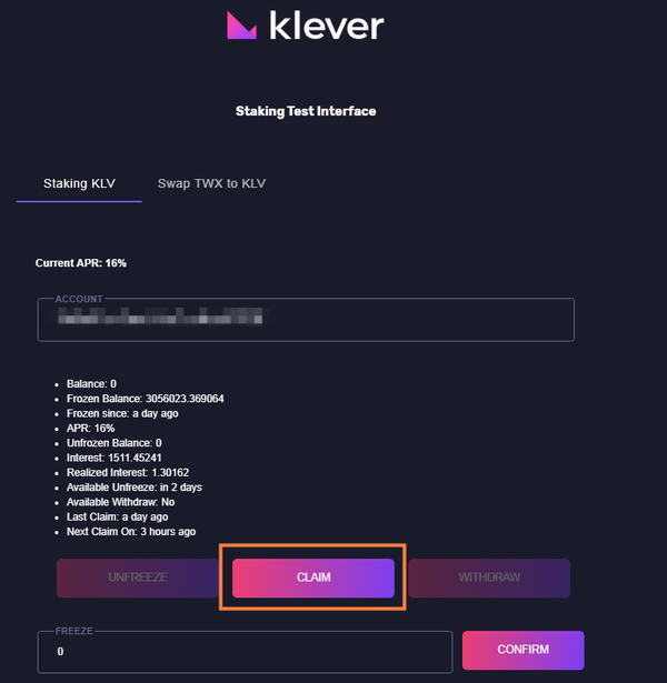 Clam 을누르면 Balance로 일 배당금이 들어오고, 1) Freeze에 입력후 2)Confirm 을 누르면 재 스테이킹 되는 형식입니다.