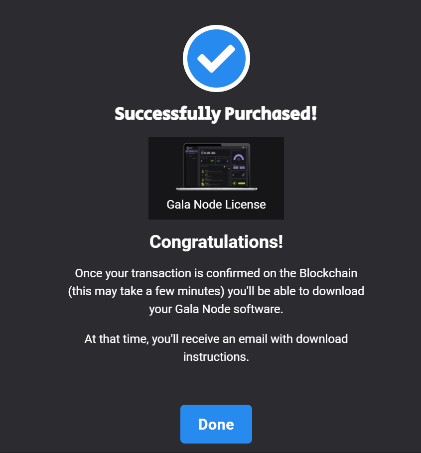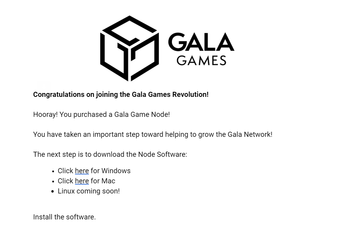 노드 라이센스 구매를 축하하는 메일이 아래와 같이 와 있을겁니다. (제목: Congratulations on your Gala Games Node)