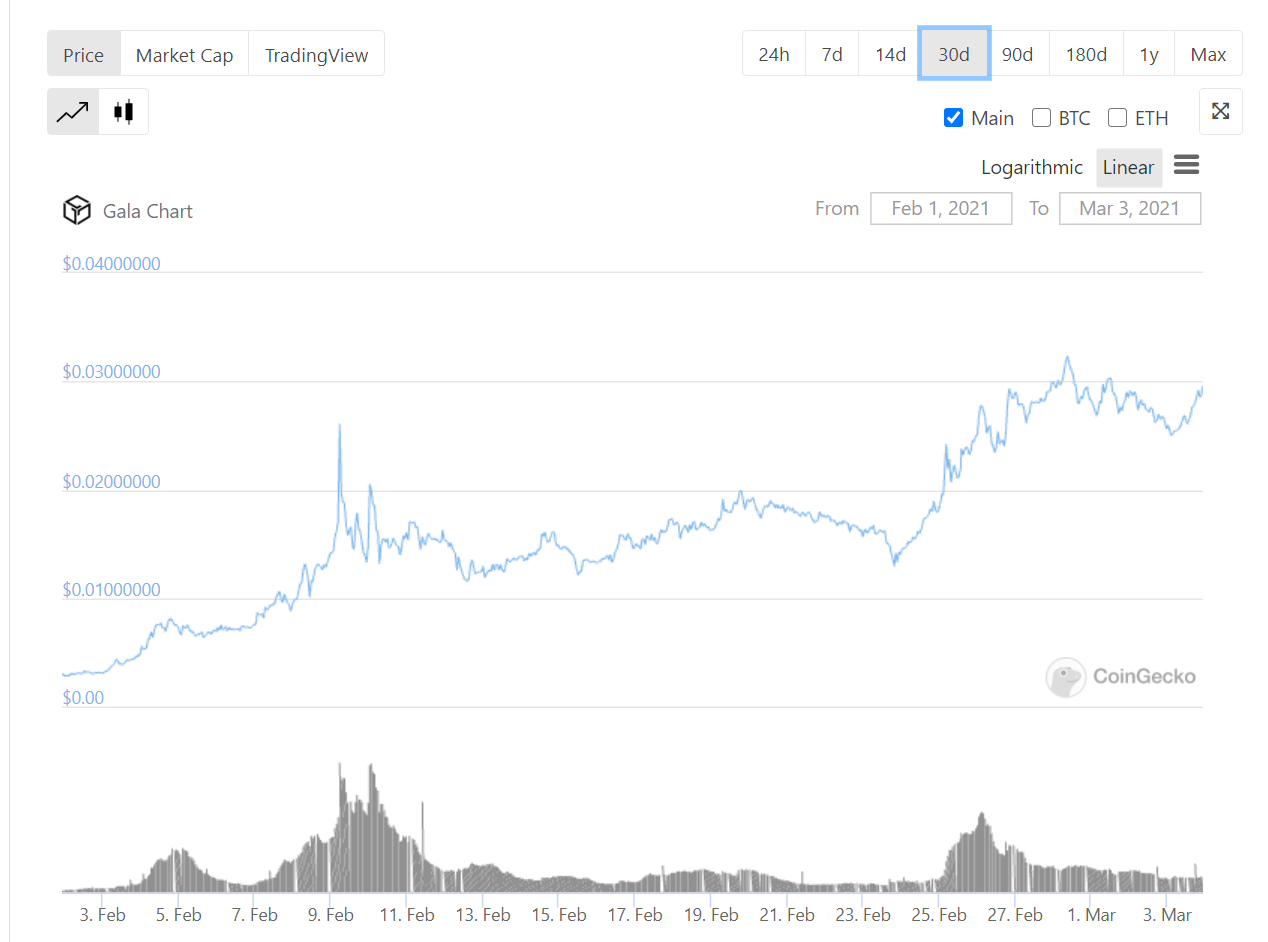 GALA 가격을 확인해봅시다. 최근 한달 거의 10배 뛰었군요... 지금은 거의 0.03에 근접해가는중.