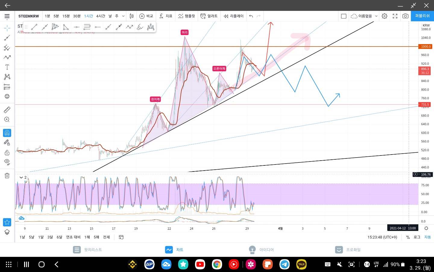 1.붉은 화살표를 보시면 저항선이랑 어센딩 수렴하면서 1000원을 뚫고 하늘로 올라갈수있는 차트입니다 . 보통 어센딩 트라이앵글을 만들고 하늘로 올라가는 경우가 많기 때문에 특히 rsi부분 다이버전시, 하향중인데도 상승하고 있는 차트이다보니 전 1000원은 가볍게 뚫을거라 예측합니다.