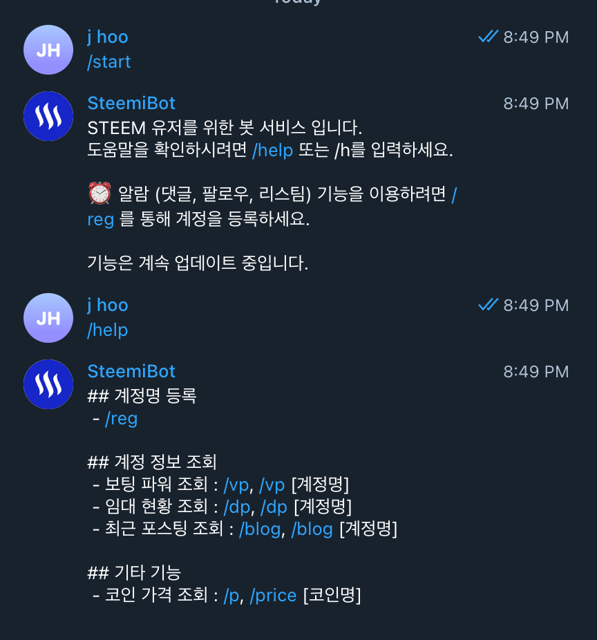 알람 기능을 사용하려면 /reg 명령을 통해 계정명을 등록하면 댓글, 팔로잉, 리스팀이 될 경우 알림메시지를 받을 수 있습니다. 그리고 등록된 계정은 다른 정보 조회 명령어 입력 시 계정명을 별도로 입력하지 않아도 조회 가능하도록 만들었습니다.