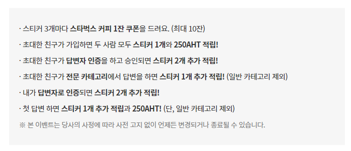 지인 초대만 하더라도 3명당 스타벅스 커피 1잔을 받을 수 있고, 초대한 친구가 가입하면 모두 추가 아하토큰도 지급받을 수 있다고 하니 다른 사람들보다 빨리 가입하고 먼저 살펴보면 좋을 듯 싶습니다.