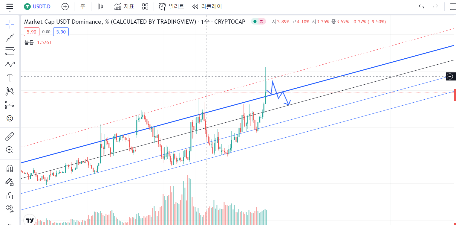 아래 보시는 차트는 테더 도미넌스(Tether Dominance) 주봉 차트 입니다. 아시다시피 테더 도미넌스와 비트코인 가격과는 디커플링 관계입니다. 따라서, 테더 도미넌스의 움직임을 살펴봄으로써 비트코인 가격의 추이를 예상해 볼 수 있습니다.