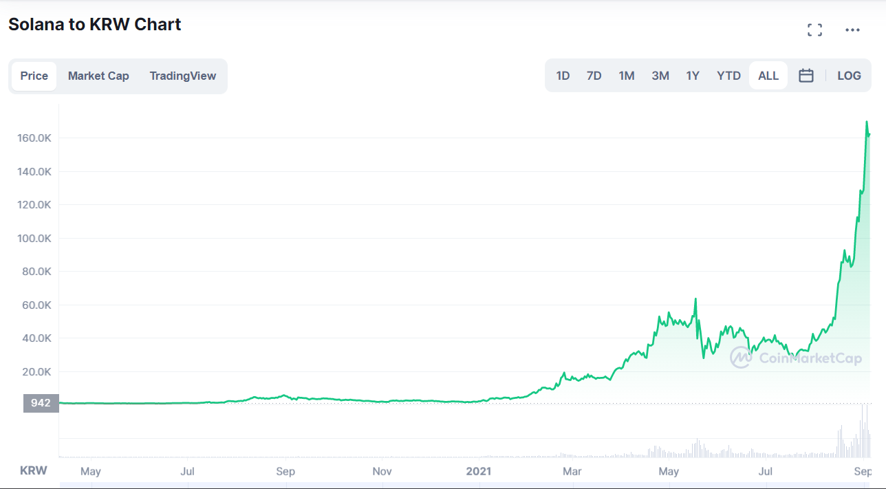 작년에 천원 언저리에서 놀던 솔라나가 16만원을 넘겼다..