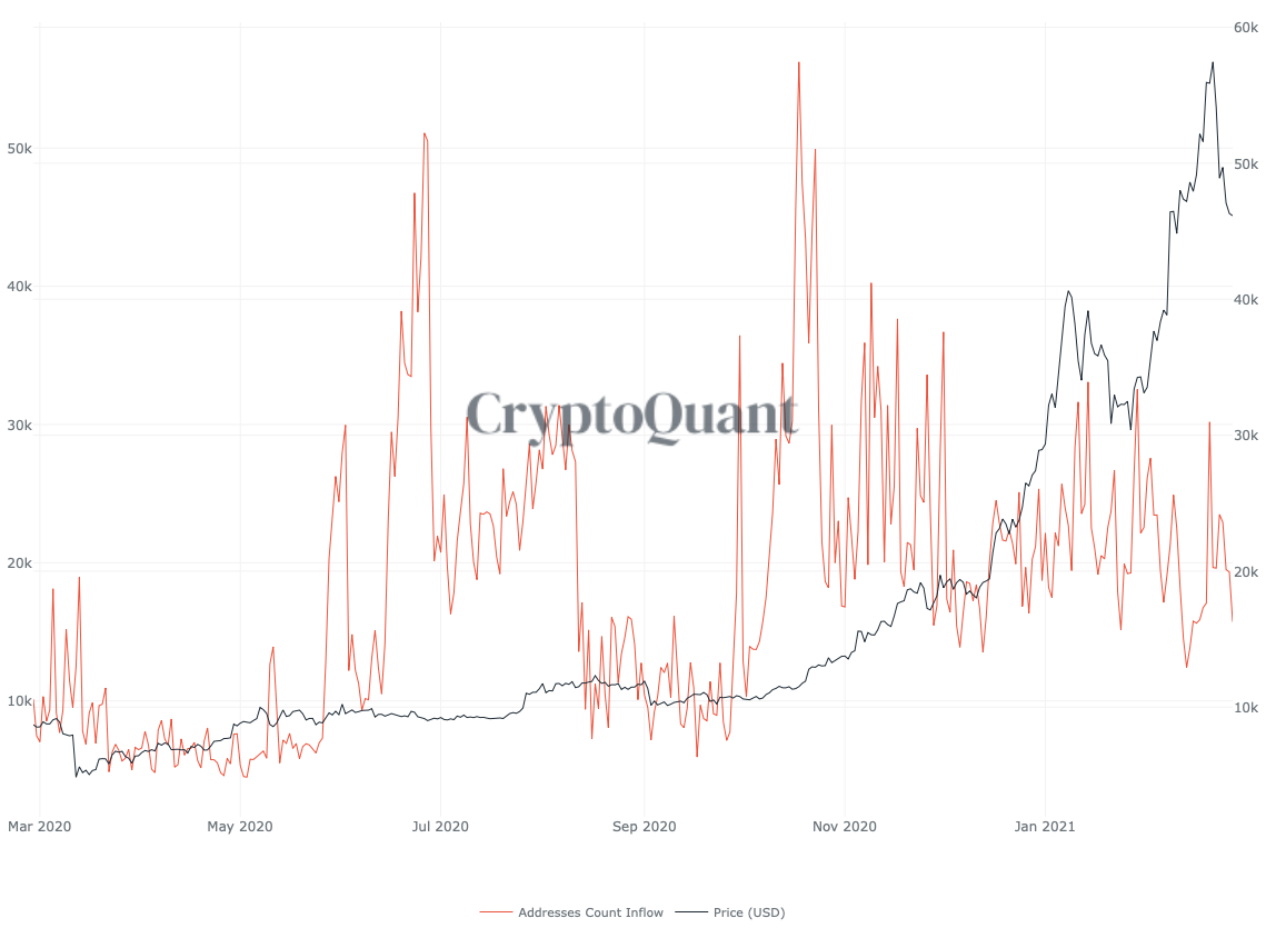 코인베이스와 바이낸스 간의 가격차를 나타내는 지표입니다. 지난 글에서 이야기한 것 처럼, 기관은 코인베이스를 중계로 비트코인을 구매합니다. 한 번 구매하면 대량구매를 하기 때문에 프리미엄이 발생하게 되구요. 횡보를 할 때 코인베이스 프리미엄이 플러스가 되면, 상승을 가능성이 높다고 생각하면 되겠습니다. 반대로 시장은 상승을 하고 있는데 이 지표가 마이너스를 가르키면 조정이 올 확률이 크다고 볼 수 있습니다. (유료버전을 사용해야 최근 자료를 볼 수 있군요.)