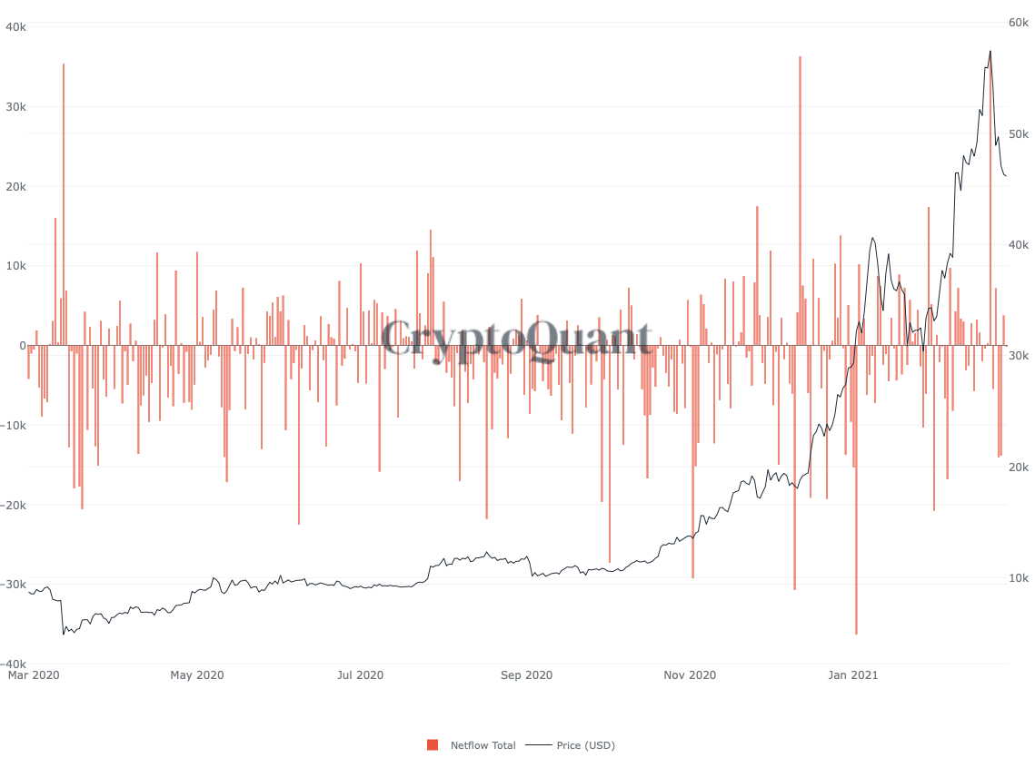 거래소로 입금되는 비트코인의 양과 출금되는 비트코인의 양을 뺀 순 유입량을 나타내는 지표입니다. 입금량이 많을수록 하락 가능성이 크다고 볼 수 있겠습니다.
