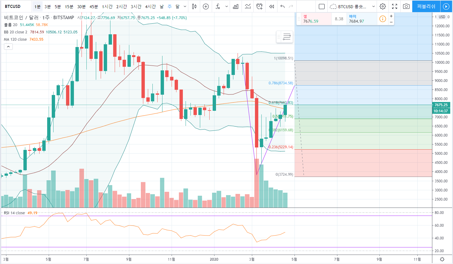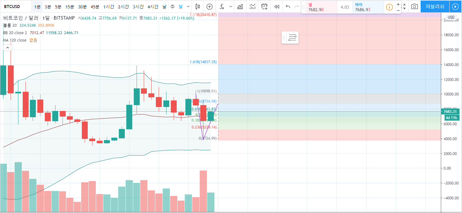 현재 피보나치 0.618지점을 터치하였으며, 해당 부근을 돌파한다면