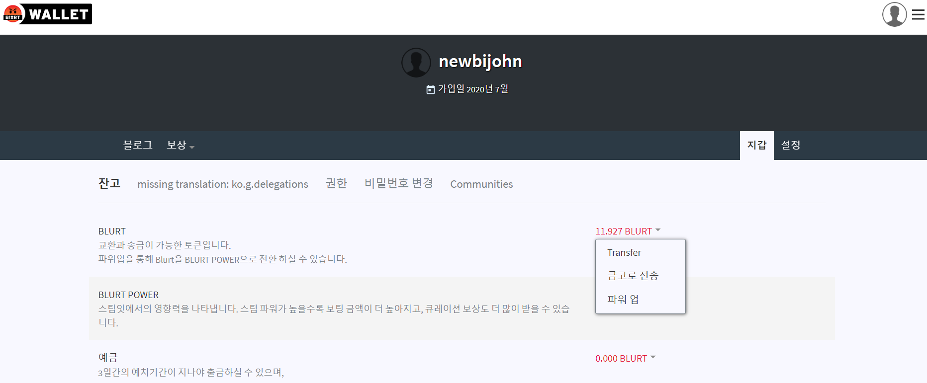 먼저 https://blurtwallet.com/@newbijohn/transfers 이 부분에서 자신의 닉네임으로 변경해주세요.