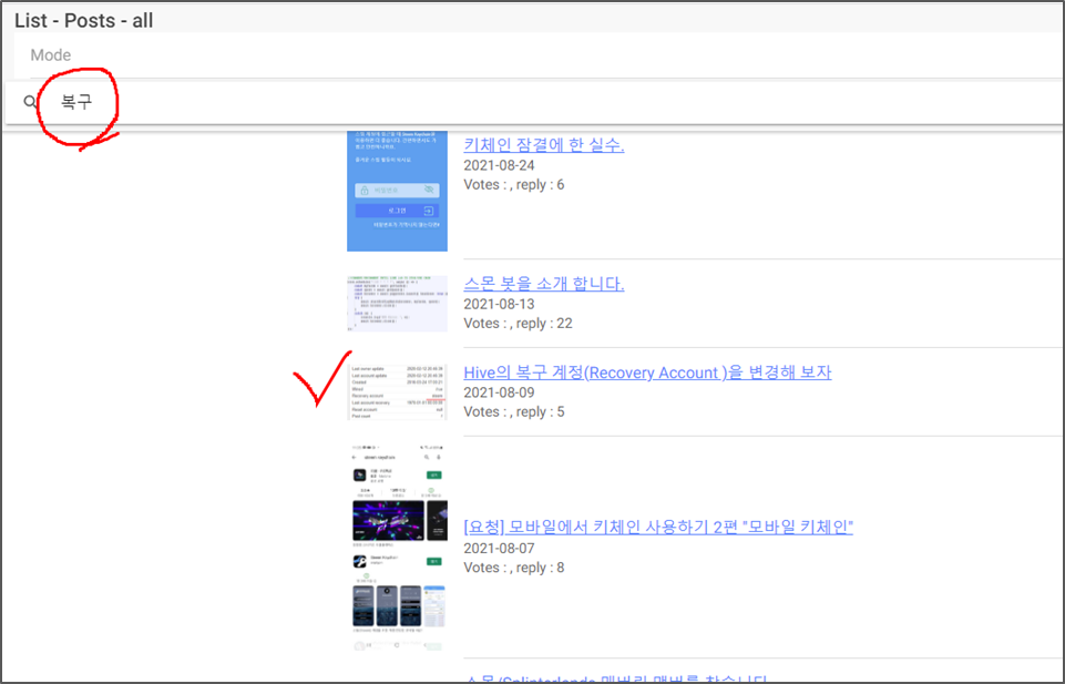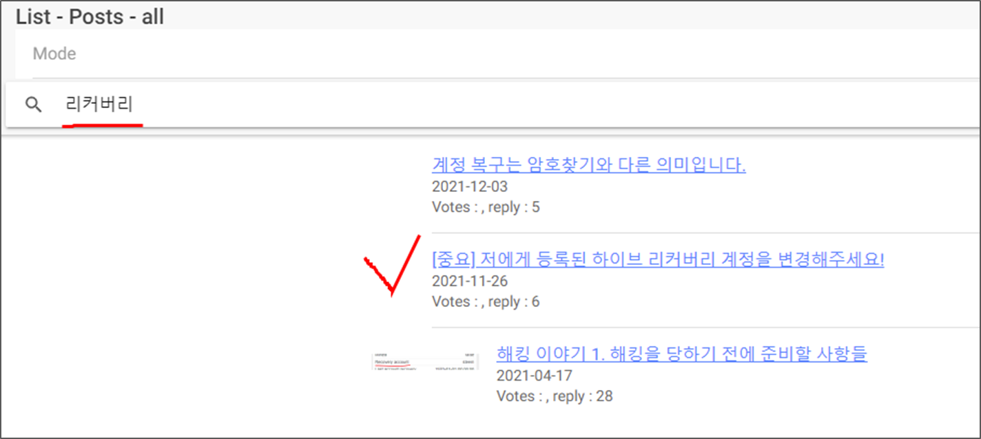 '복구' 라는 키워드가 들어있는 포스팅들이 검색이 되고,
