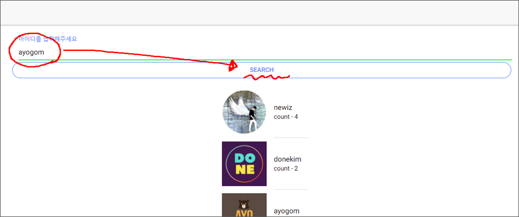 ayogom님의 아이디를 입력한 후 'SEARCH' 버튼을 누른다.