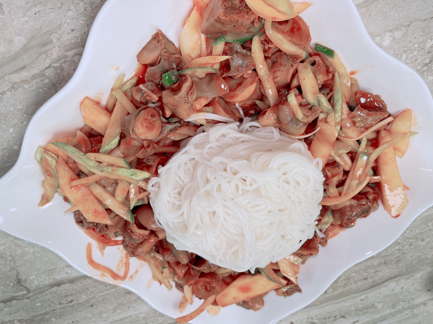 그리고 찬물로 헹궈준 다음에 물기를 빼고는 골뱅이무침이 담겨있는 접시에 살포시 올려줬습니다.
