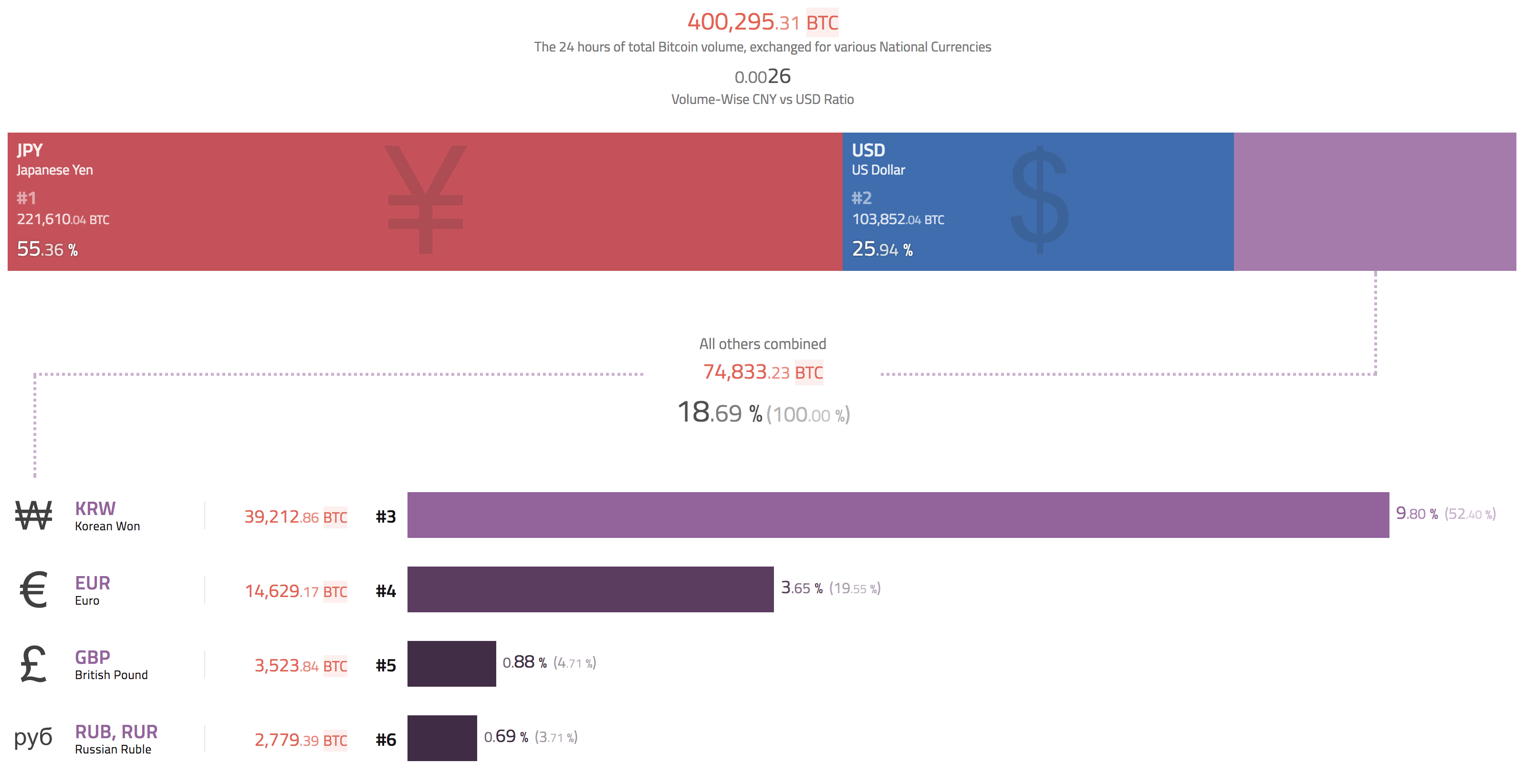 3) 비트코인 점유율이 기존 아시아권 -> 북미/유럽권으로 이동중인게 선명하게 보임. 2017년 11월만 해도 비트코인의 통화별 점유율은 USD가 26%, EUR가 3.7%밖에 안됐었는데, 지금은 USD가 무려 72%, EUR가 4.6%까지 치솟았음.