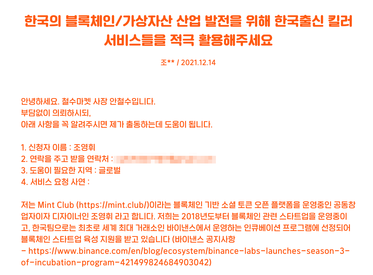 안대표님이 국내출신 블록체인 기반 킬러 서비스들을 적극 활용하면, 크립토 친화적인 MZ세대들의 호응을 얻을 수 있고, 바이럴 효과도 극대화 할거다... 일초마켓 같은 플랫폼을 적극 활용해 달라.. 대략 이런 내용을 남겼습니다 ㅎㅎ