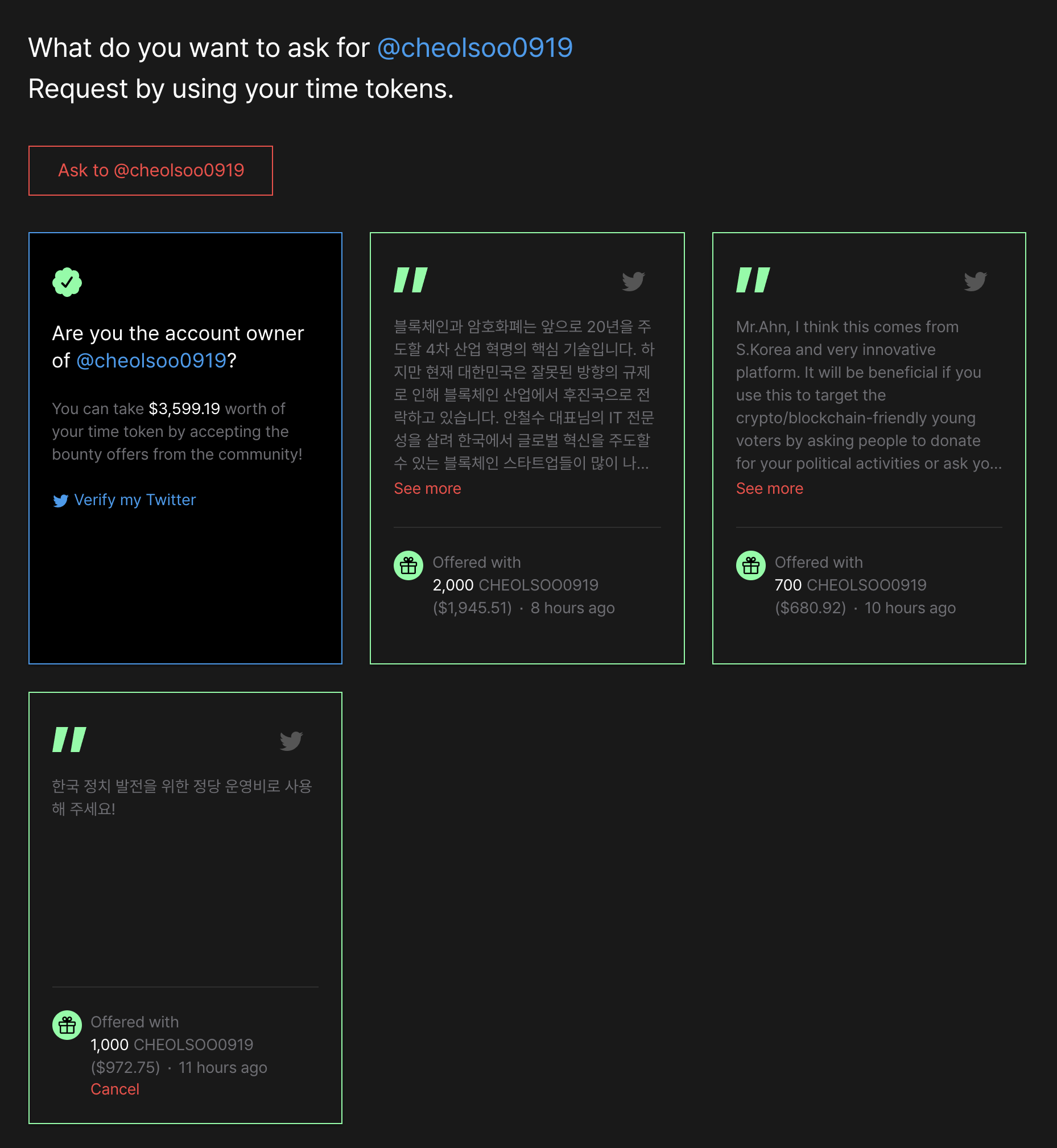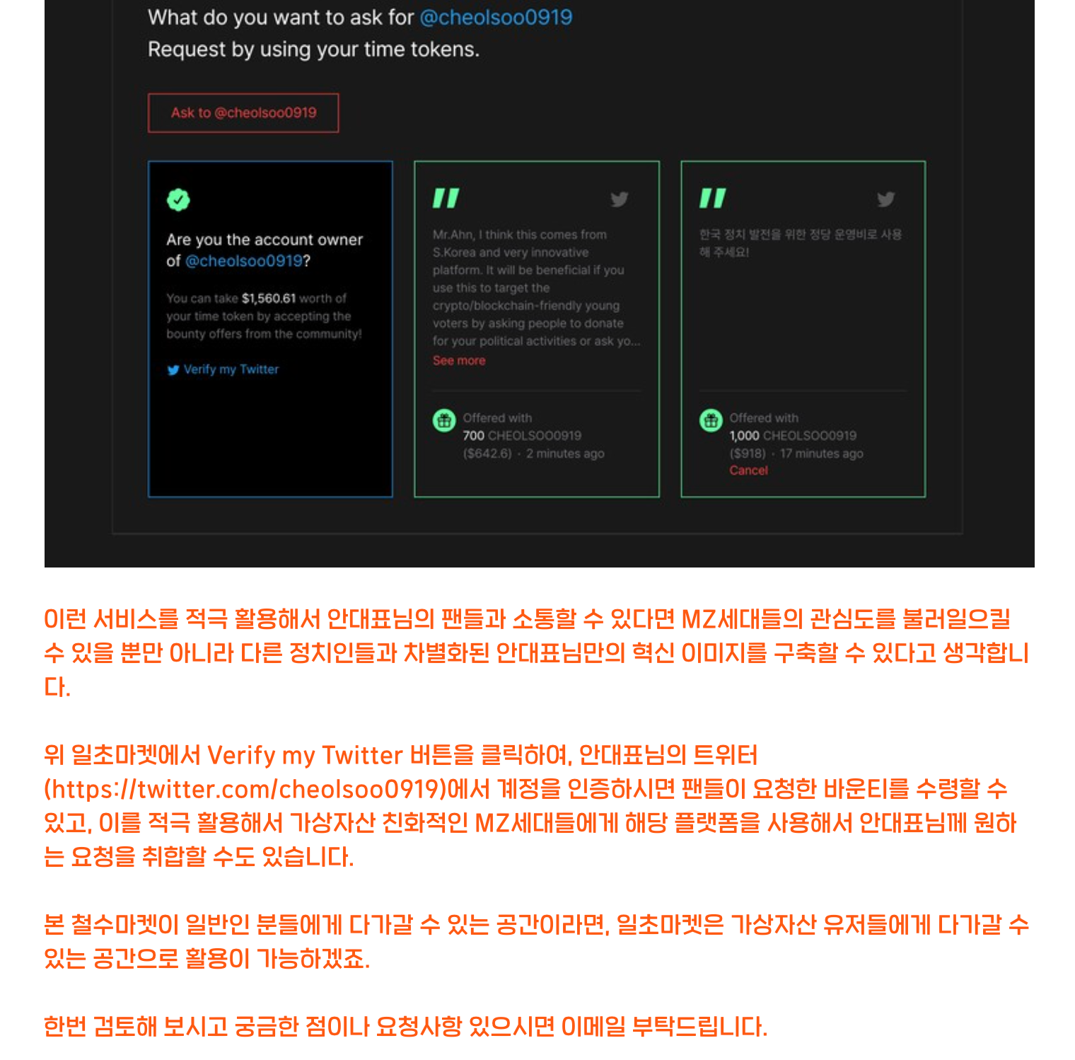 제가 안철수대표님이라면, 어중간하게 하지 않고 오히려 일초마켓 같은 크립토 기반 플랫폼을 활용해서 시도했었다면 바이럴도 크게 나고 효과가 훨씬 좋았을것 같은데 아쉽더군요. 그래서 서비스 신청하기에 일초마켓에 대한 제안을 남겼습니다 ㅎㅎ 마침 일초마켓에 누가 안철수대표님 트위터를 등록했더군요. 리퀘스트도 달려있습니다.