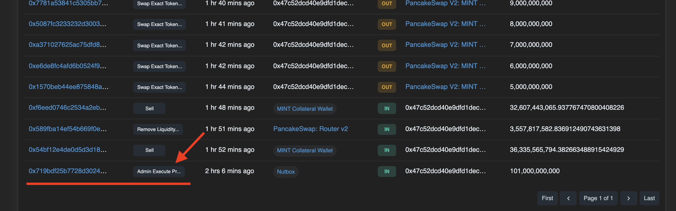 민트클럽과 파트너쉽을 맺은 넛박스 플랫폼에서 컨트랙트의 어드민 권한 탈취를 통한 대량의 해킹 사태가 발생한 것입니다. 넛박스 쪽에 저희쪽 유저 분들이 (저희 팀 개인들도 포함) 스테이킹한 약 1,730억개에 달하는 민트 토큰이 넛박스측 컨트렉트에서 탈취당했습니다.
