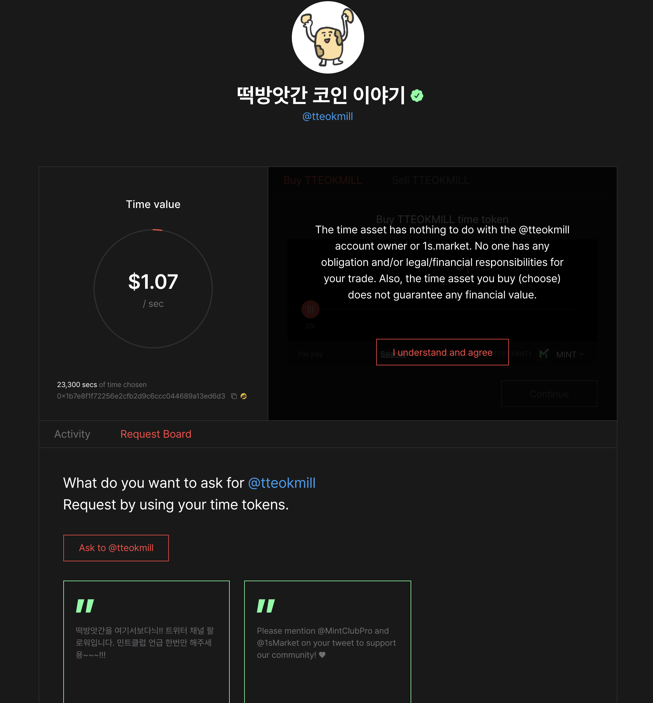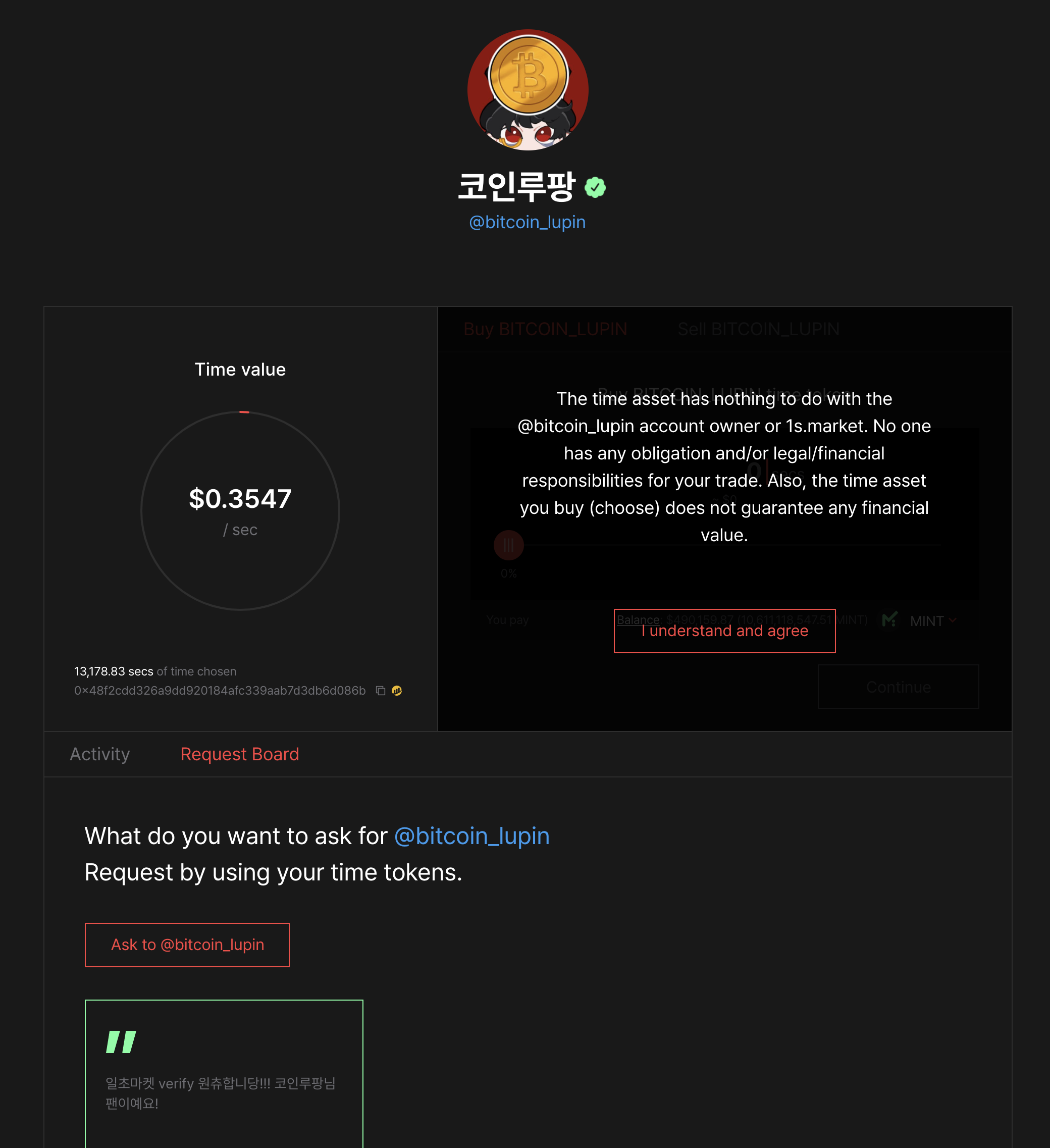 일초마켓에 한국분들이 슬슬 온보딩 하는 중입니다project7 (73)in SCT.암호화폐.Crypto • 4 years ago 오늘 일초마켓에 한국 채널 주인분들이 몇분 온보딩하셨습니다. 떡방앗간 코인이야기님 도지사운드클럽에서 핵인싸인 메도님 코인루팡님 슬슬 온보딩하는 계정 주인분들이 늘어나면 일초마켓이 더 활성화될 수 있겠네요. #mint #mintclub #onesec #sct #krsuccess