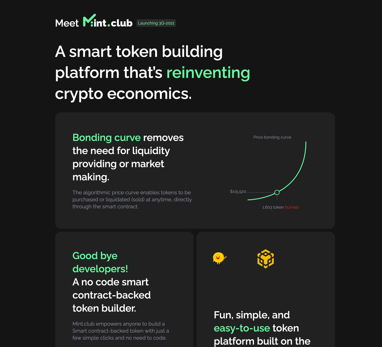 저희가 엊그제 민트 클럽 사전가입을 시작했죠. 민트 클럽은 누구나 스마트 토큰 (Smart Token)을 만들고 운영할 수 있는 전혀 새로운 방식의 토큰 이코노미 빌딩 플랫폼 입니다.