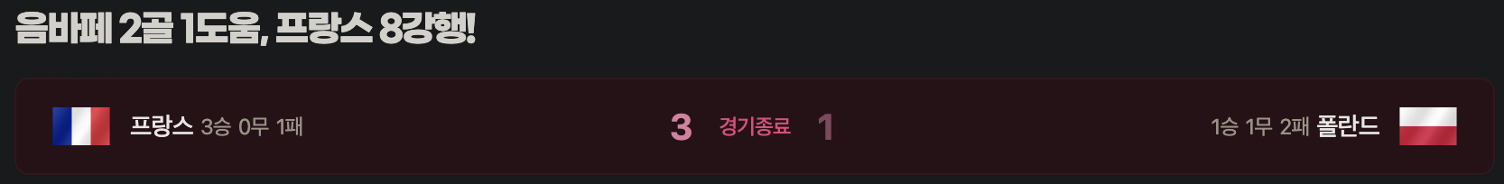 프랑스가 폴란드를 3-1로 꺾고 8강에 진출했네요.