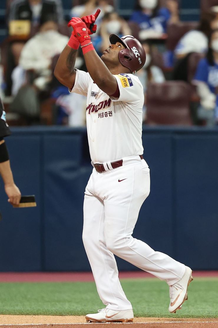한국야구단 정규시즌 경기 4 회째인 9 월 29 일 서울 고척 스카이돔에서 열린 삼성 라이온과의 단독 홈런을 기념하는 기움 히어로즈 야시엘 푸이그. 20. 연합
