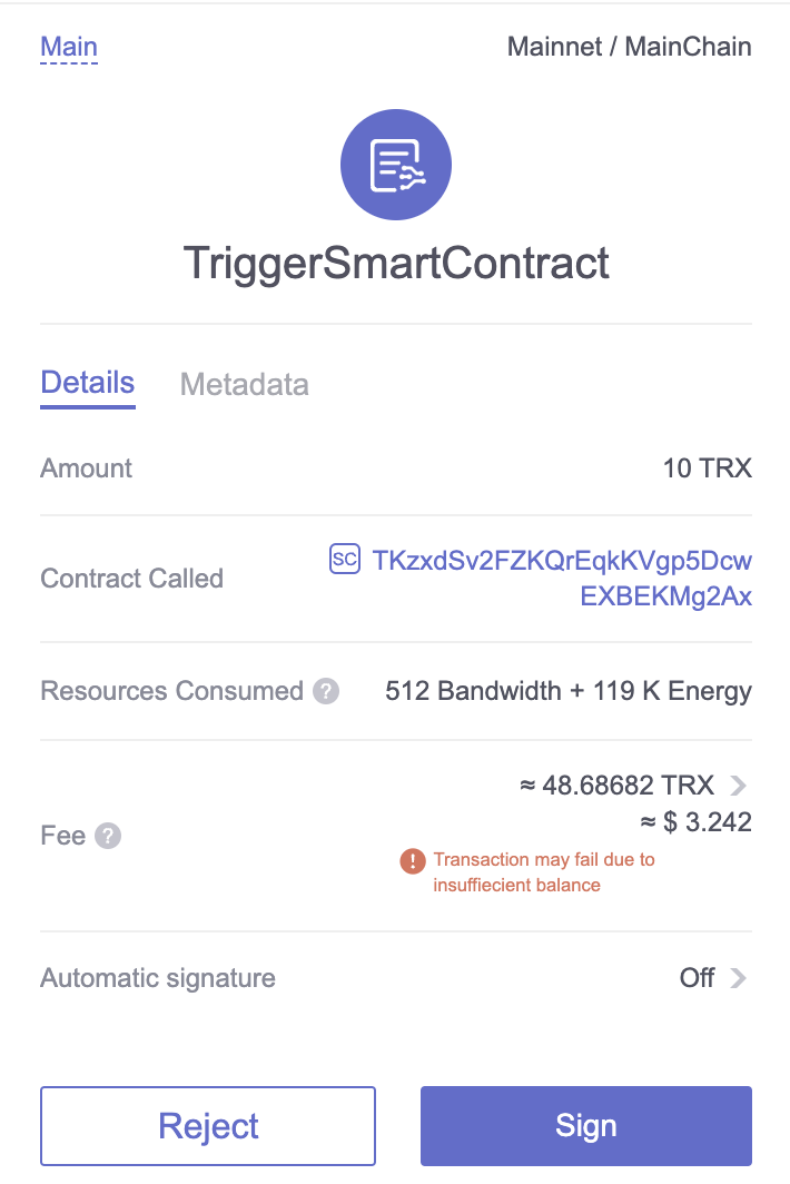 - 위 이미지에서 볼 수 있는 것처럼 Sunswap에서 TRX를 USDC로 스왑하는데 약 48 TRX를 지불해야 합니다