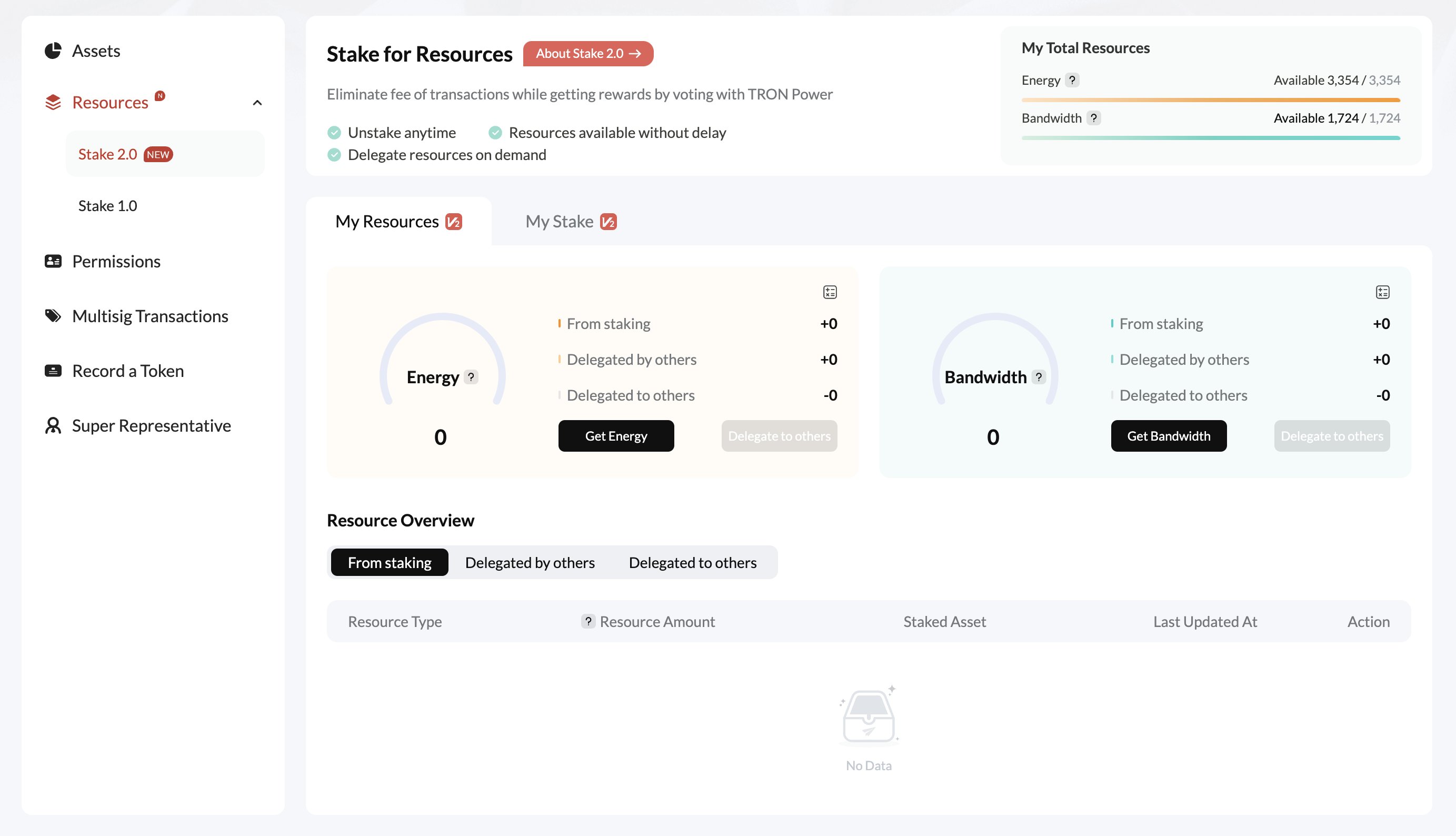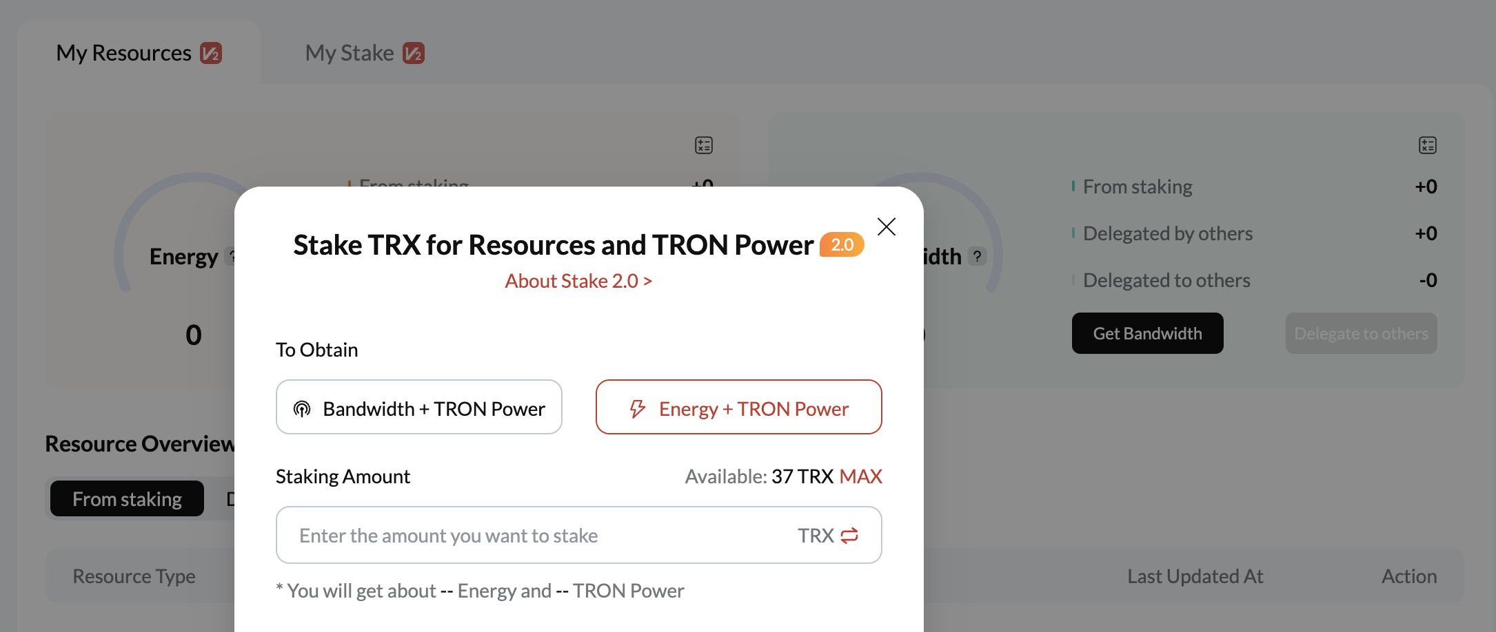 - 스테이킹 수량이 많을수록 많은 리소스를 얻게 되며, 스테이킹한 TRX의 수량이 너무 적은 경우에는 트랜잭션을 발생시킬 때 TRX를 수수료로 지불해야 합니다