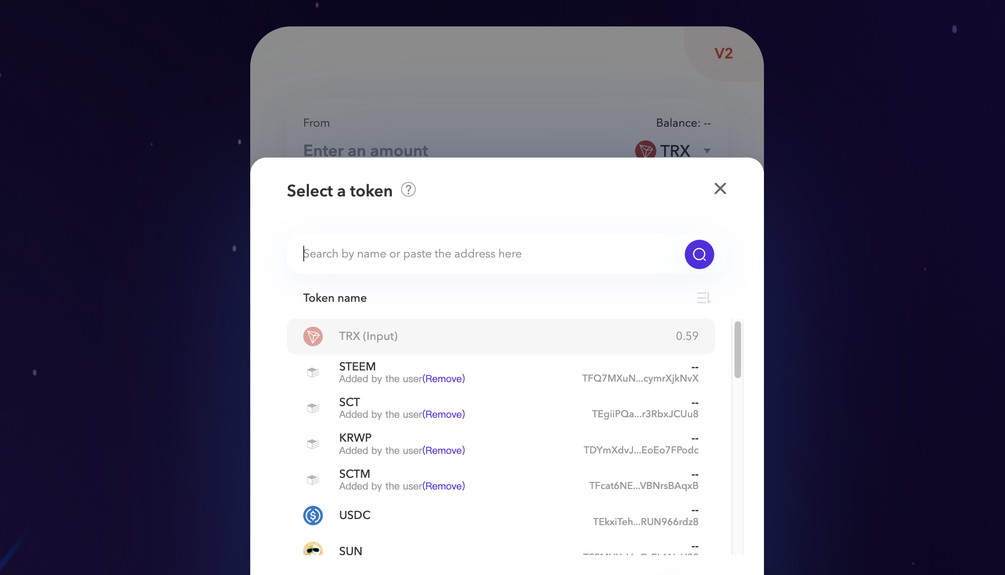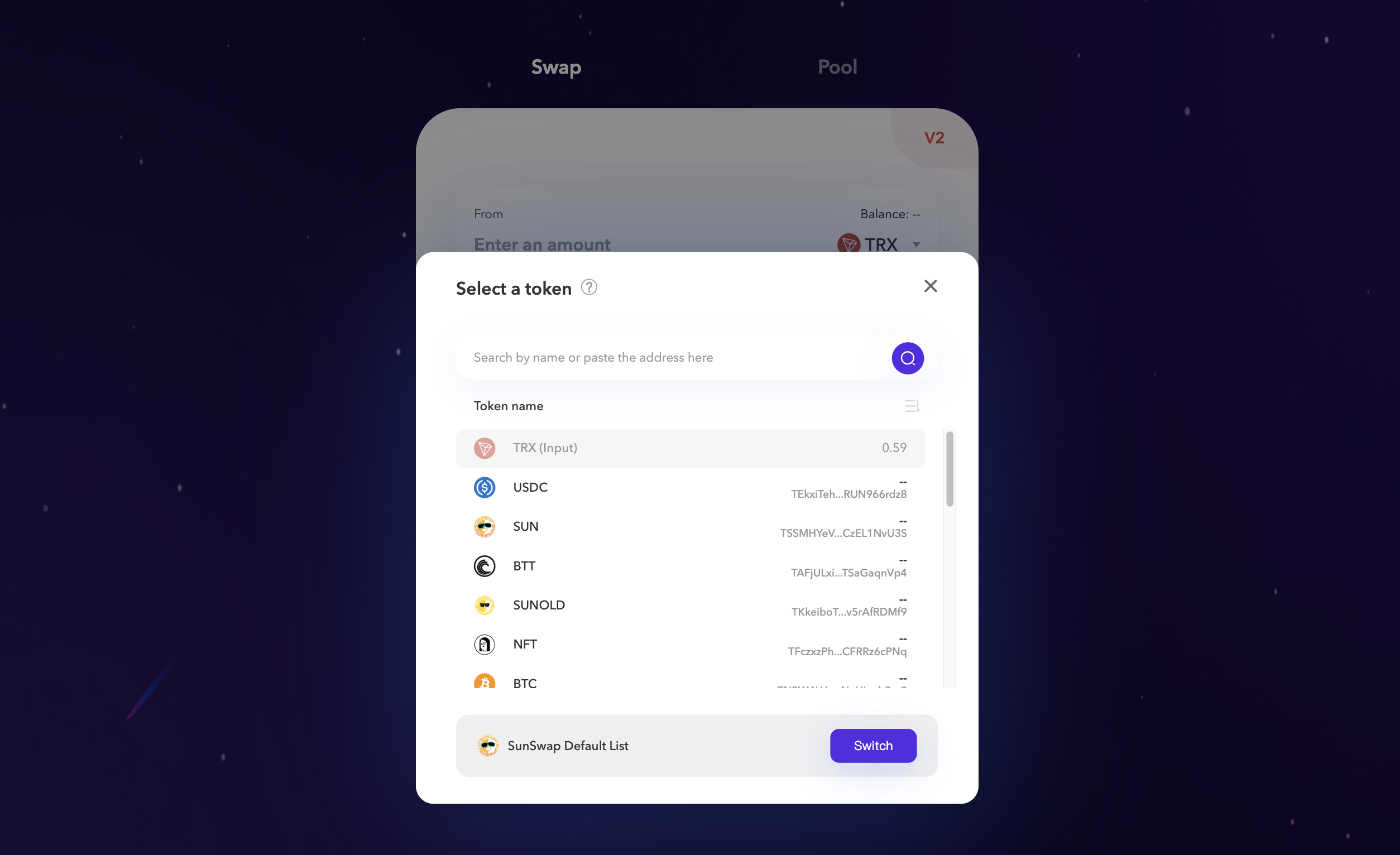 위 주소가 Sunswap V2로 바로 연결되는 주소입니다