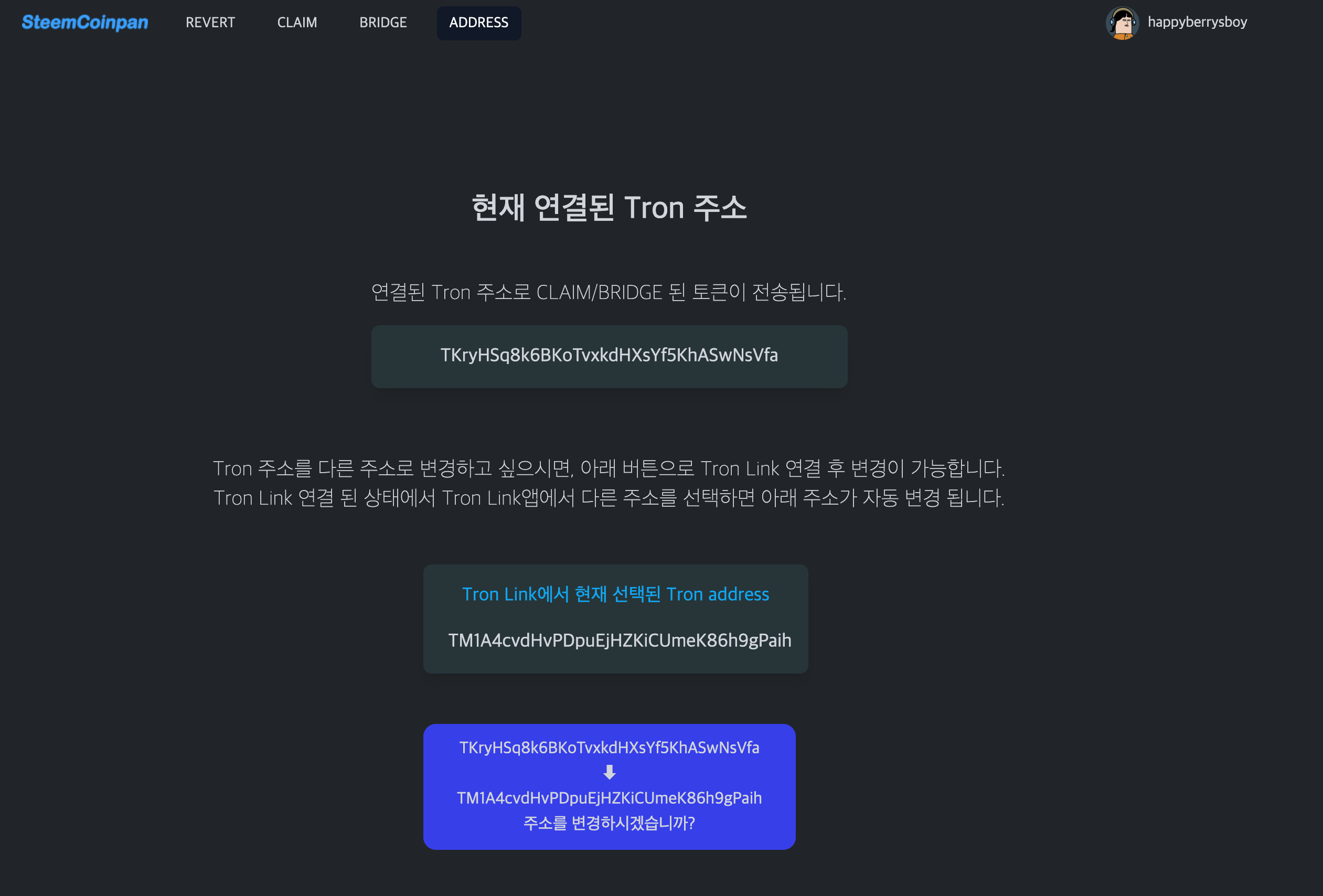 그 다음 위와 같은 팝업창이 나타나면 확인 버튼을 클릭하여 트론 지갑 주소를 변경할 수 있습니다. 그 다음에 위에서 안내한 클레임을 진행하시면 됩니다.