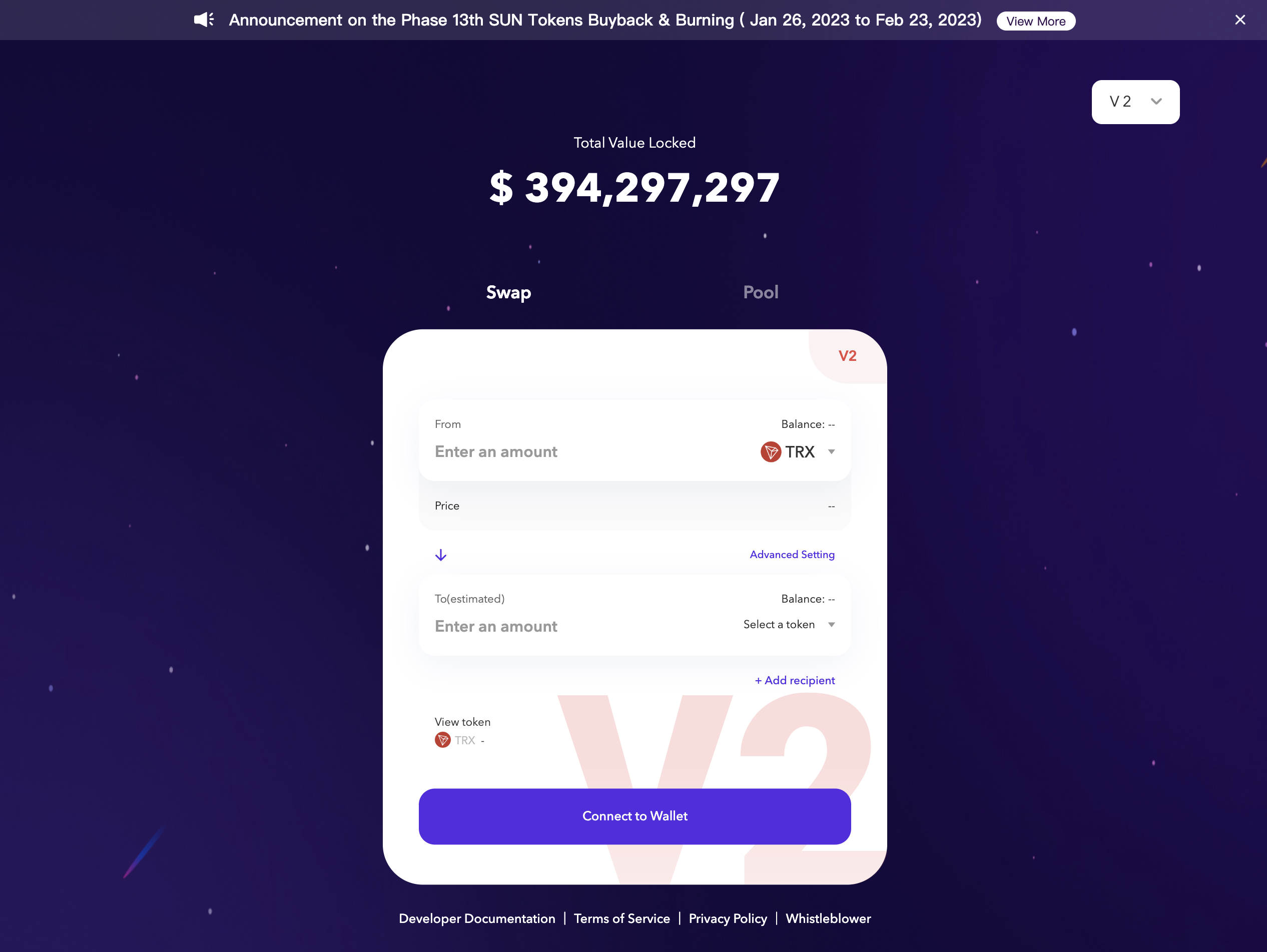 - 썬스왑 웹사이트(https://sunswap.com/#/v2?lang=en-US&t0=T9yD14Nj9j7xAB4dbGeiX9h8unkKHxuWwb&type=swap)에 접속하고 트론 지갑을 연결하세요