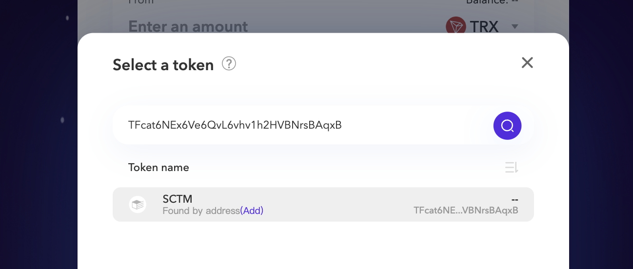 - 화면 가운데에 TRX 옆 화살표를 클릭하고, 위와 같은 화면이 나타나면 아래의 컨트랙트 주소를 복사하여 붙여넣기 하세요