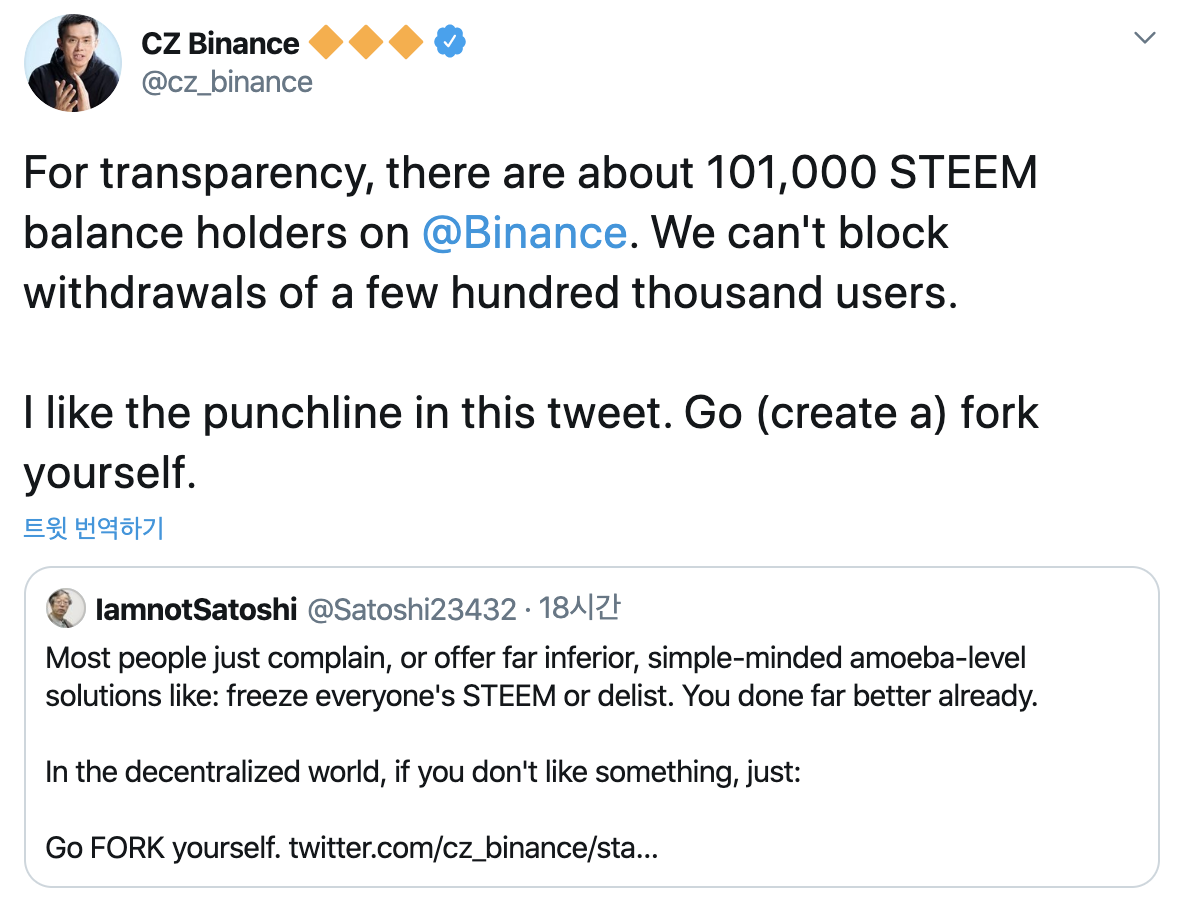이와 관련해 오늘 바이낸스의 CEO 인 창펑자오가 트위터에 재밌는 이야기를 올렸습니다.