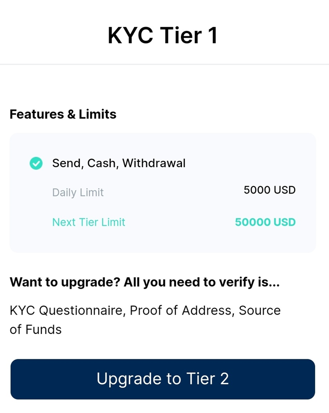 오늘 KYC를 완료했더니 Tier 1로 일일 출금 금액 5,000불 한도로 출금이 가능한 상태로 전환되었다